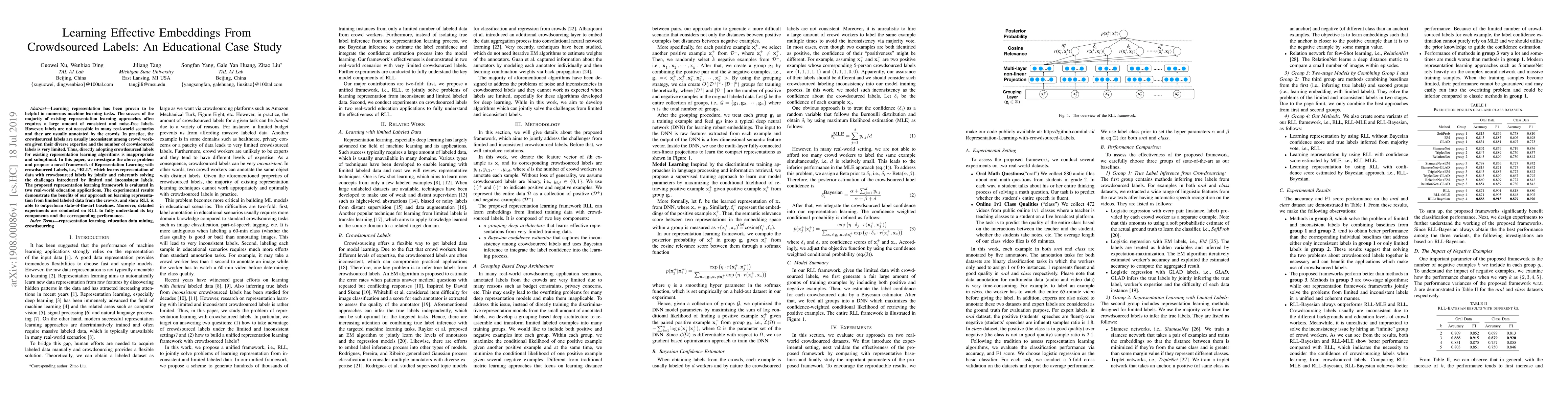 This paper proposes a novel framework called RLL for learning effective representations using crowdsourced labels, which are often inconsistent and limited. The RLL framework addresses these challenges and outperforms state-of-the-art baselines in two educational applications, demonstrating its effectiveness in real-world scenarios.