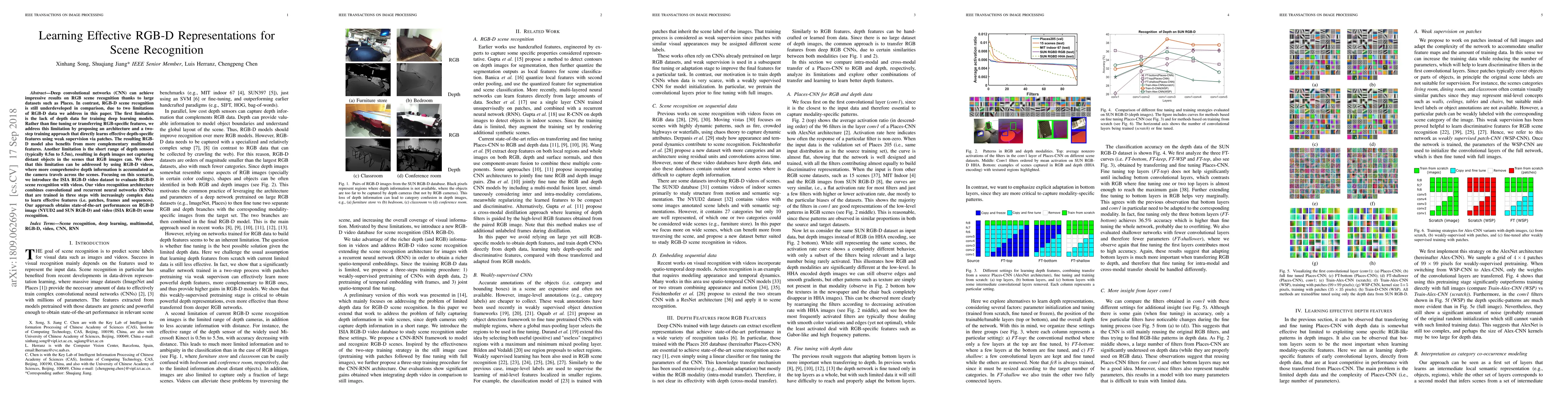 This paper proposes an architecture for learning effective RGB-D representations for scene recognition, addressing the lack of depth data and the short range of depth sensors. It introduces a two-step training approach and a new RGB-D video dataset for improved scene recognition, achieving state-of-the-art performance.