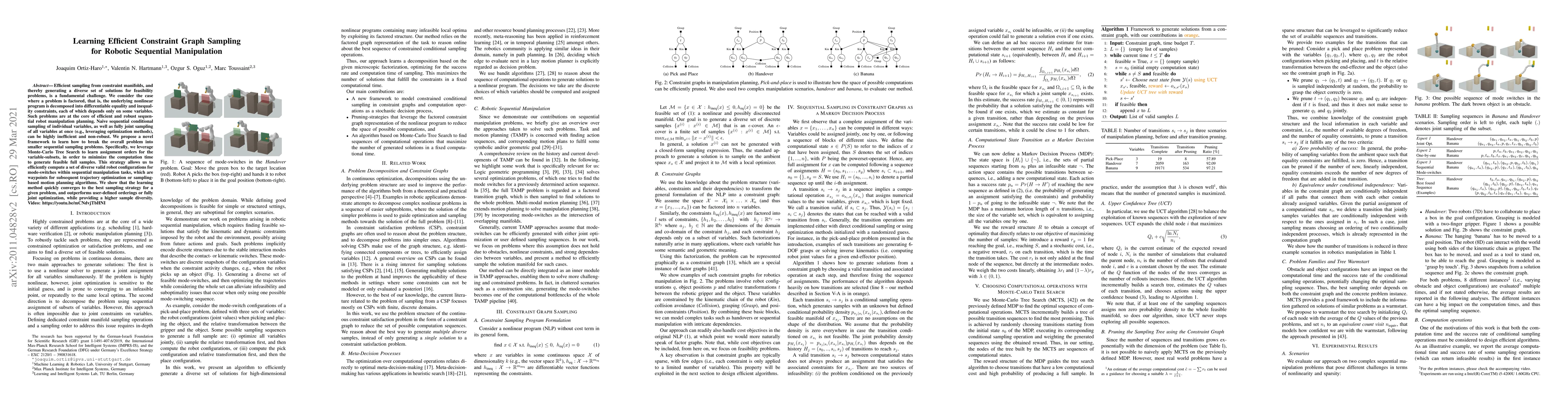 This paper proposes a novel framework to efficiently sample from constraint manifolds for robotic sequential manipulation planning by decomposing problems into smaller sequential sampling tasks. Using Monte-Carlo Tree Search, the method learns optimal variable-subset assignment orders, achieving faster computation and higher diversity in feasible robot configurations compared to traditional methods.