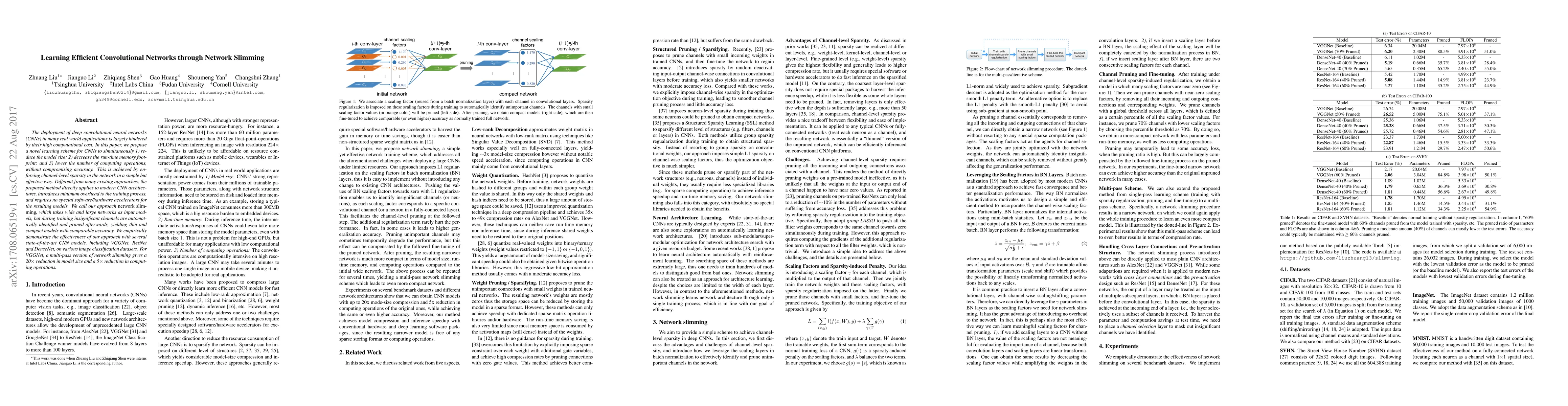 This paper proposes a network slimming method to efficiently reduce the size and computational cost of deep convolutional neural networks while maintaining accuracy. The method identifies and prunes insignificant channels during training, resulting in compact models without requiring special hardware or software.