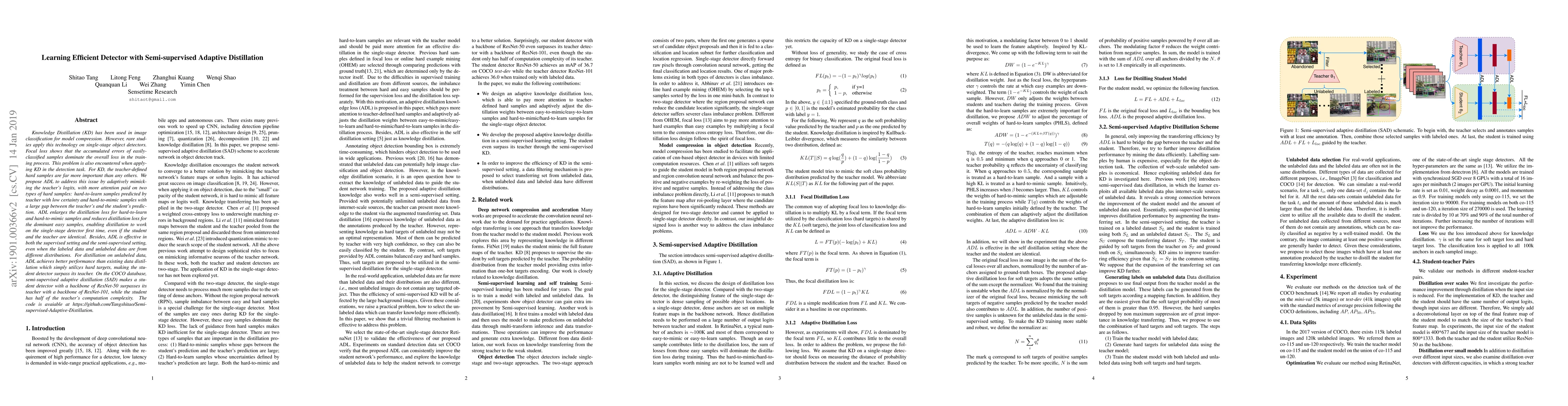 This paper proposes Adaptive Distillation Loss (ADL) to enhance knowledge distillation for single-stage object detectors, focusing on hard-to-learn and hard-to-mimic samples. ADL improves performance in both supervised and semi-supervised settings, enabling a student detector to outperform its teacher, even when they have identical architectures.