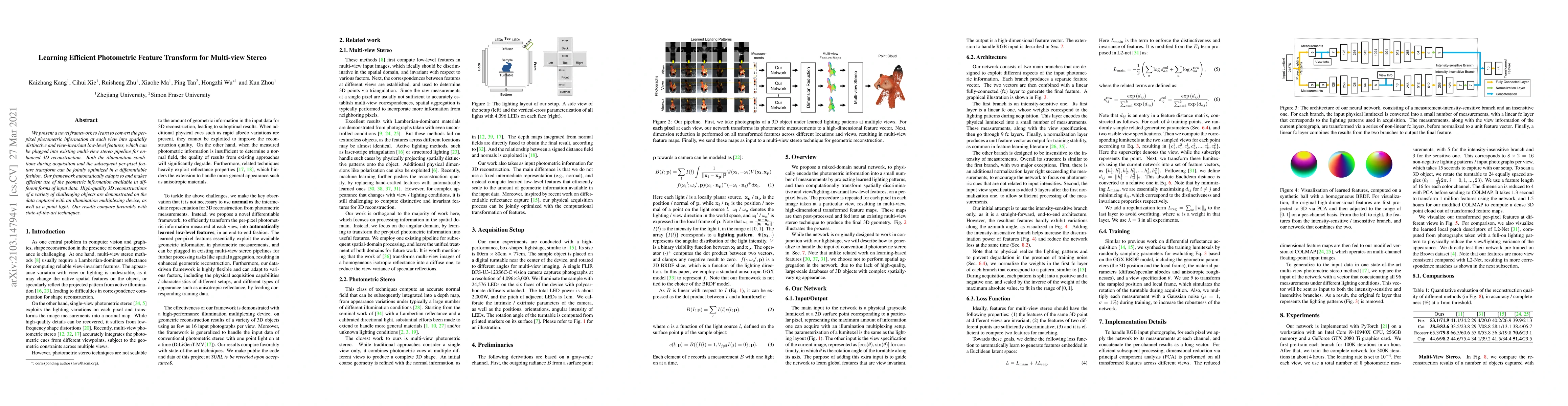 We present a novel framework to learn to convert the perpixel photometric information at each view into spatially distinctive and view-invariant low-level features, which can be plugged into existing multi-view stereo pipeline for enhanced 3D reconstruction. Both the illumination conditions during acquisition and the subsequent per-pixel feature transform can be jointly optimized in a differentiable fashion. Our framework automatically adapts to and makes efficient use of the geometric information available in different forms of input data. High-quality 3D reconstructions of a variety of challenging objects are demonstrated on the data captured with an illumination multiplexing device, as well as a point light. Our results compare favorably with state-of-the-art techniques.