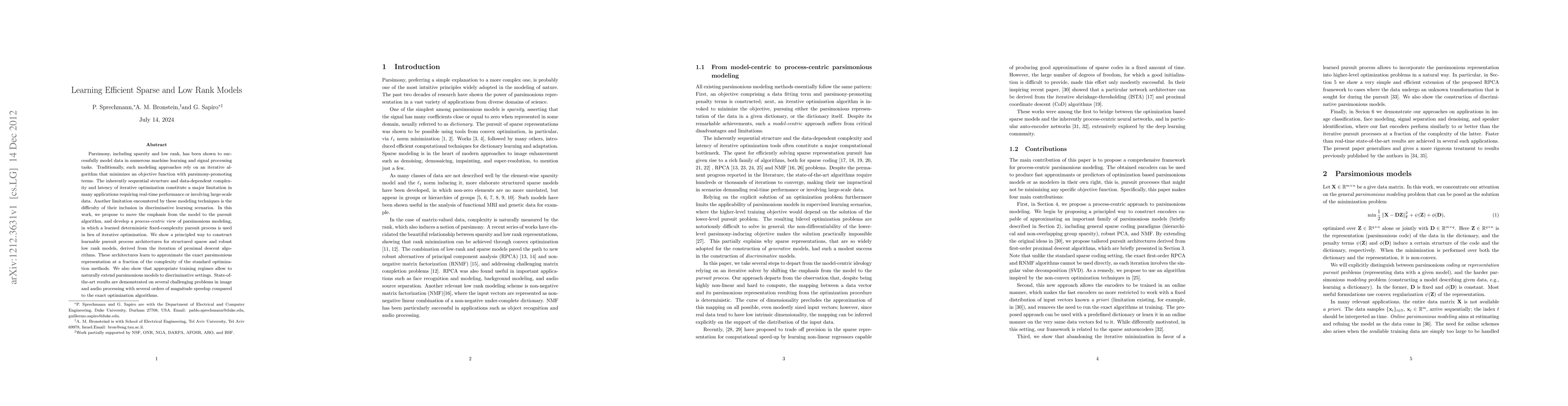 Parsimony, including sparsity and low rank, has been shown to successfully model data in numerous machine learning and signal processing tasks. Traditionally, such modeling approaches rely on an iterative algorithm that minimizes an objective function with parsimony-promoting terms. The inherently sequential structure and data-dependent complexity and latency of iterative optimization constitute a major limitation in many applications requiring real-time performance or involving large-scale data. Another limitation encountered by these modeling techniques is the difficulty of their inclusion in discriminative learning scenarios. In this work, we propose to move the emphasis from the model to the pursuit algorithm, and develop a process-centric view of parsimonious modeling, in which a learned deterministic fixed-complexity pursuit process is used in lieu of iterative optimization. We show a principled way to construct learnable pursuit process architectures for structured sparse and robust low rank models, derived from the iteration of proximal descent algorithms. These architectures learn to approximate the exact parsimonious representation at a fraction of the complexity of the standard optimization methods. We also show that appropriate training regimes allow to naturally extend parsimonious models to discriminative settings. State-of-the-art results are demonstrated on several challenging problems in image and audio processing with several orders of magnitude speedup compared to the exact optimization algorithms.
