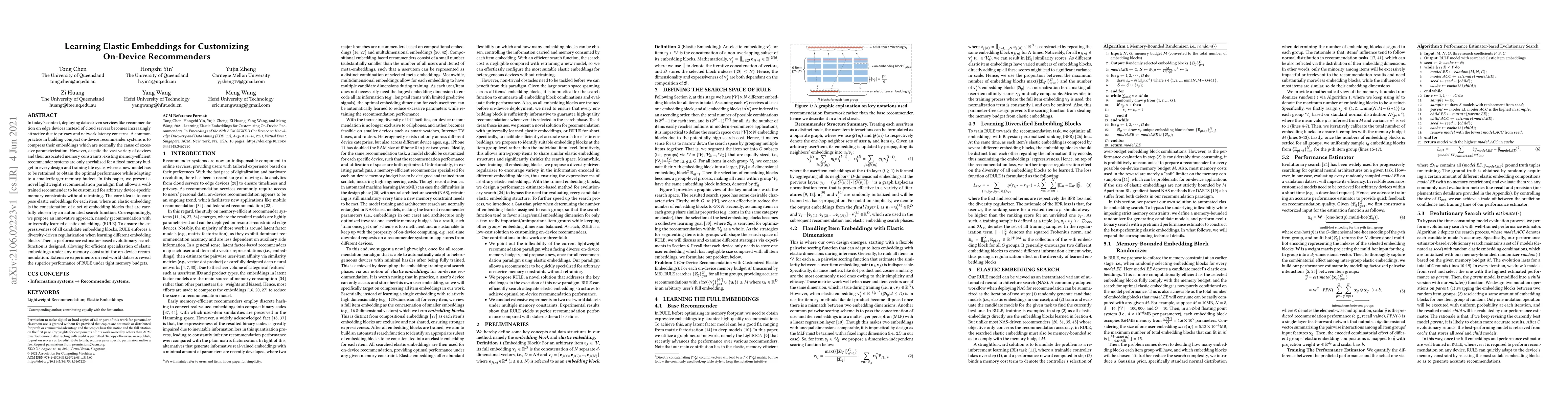 This paper introduces a novel method for customizing on-device recommenders by using elastic embeddings that can be dynamically adapted to various memory constraints without retraining. The proposed RULE approach employs a diversity-driven regularization and an evolutionary search function to efficiently specialize embeddings, demonstrating superior performance under tight memory budgets.