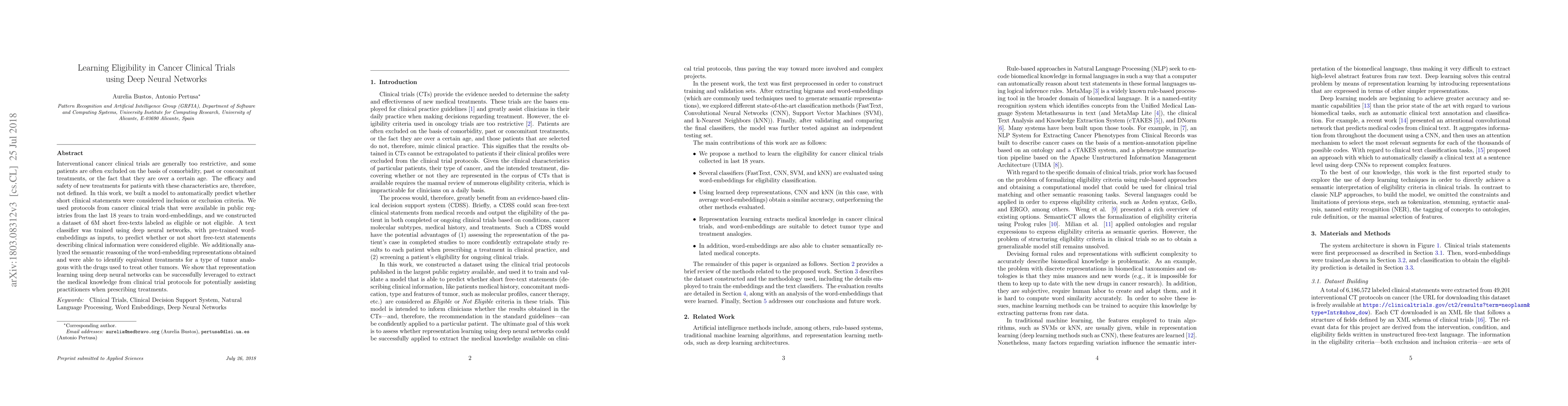 This paper develops a deep neural network model to predict eligibility for cancer clinical trials based on short clinical statements, using a dataset of 6M labeled free-texts from public registries. The model identifies equivalent treatments across different tumors, demonstrating the potential of deep learning to assist in treatment decisions for patients with comorbidities.