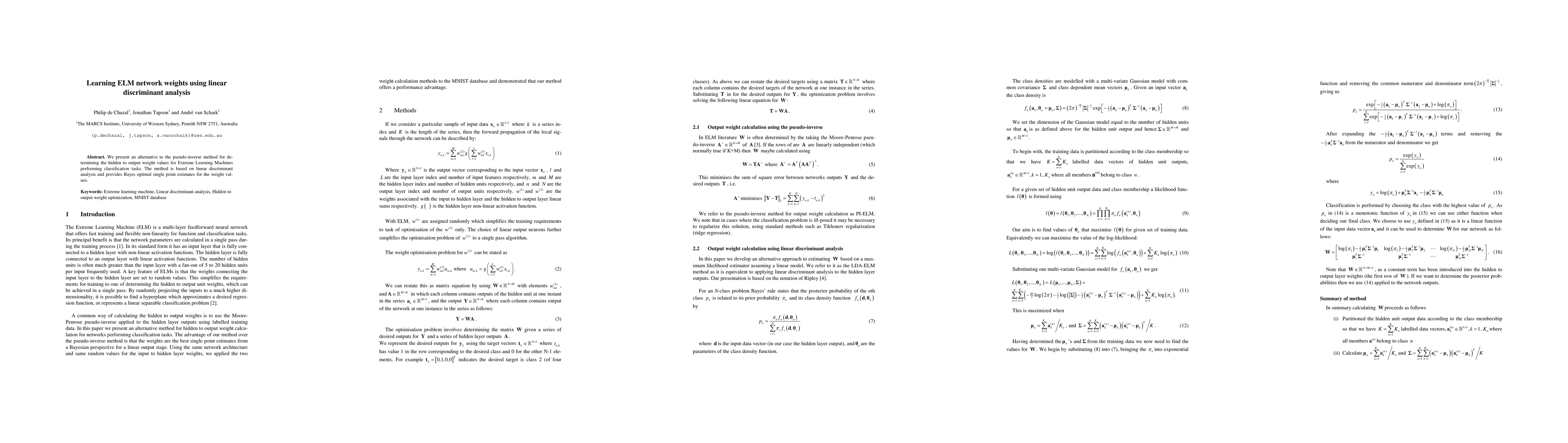 Summary: This paper proposes a linear discriminant analysis-based method to determine the hidden to output weights in Extreme Learning Machines for classification tasks, offering Bayes optimal single point estimates as an alternative to the pseudo-inverse method.