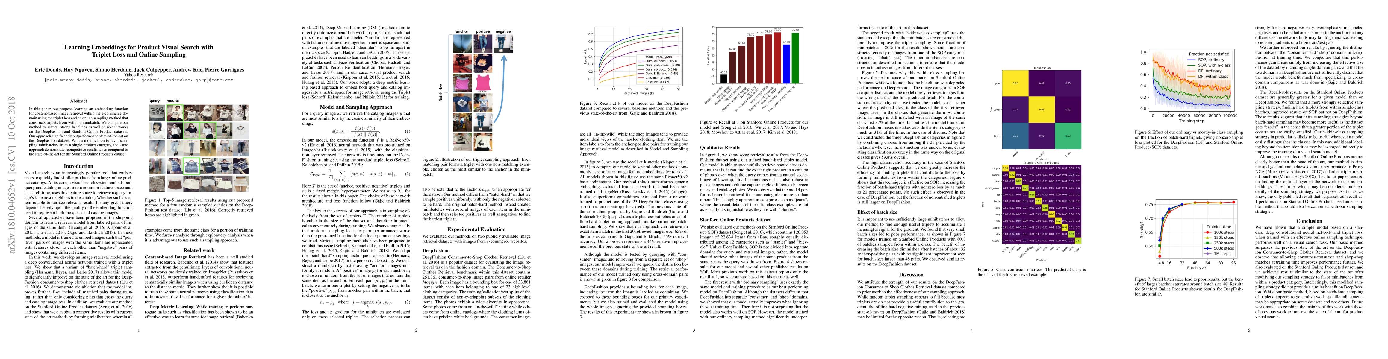 A new approach for product visual search outperforms state-of-the-art methods on e-commerce datasets, using triplet loss and online sampling.