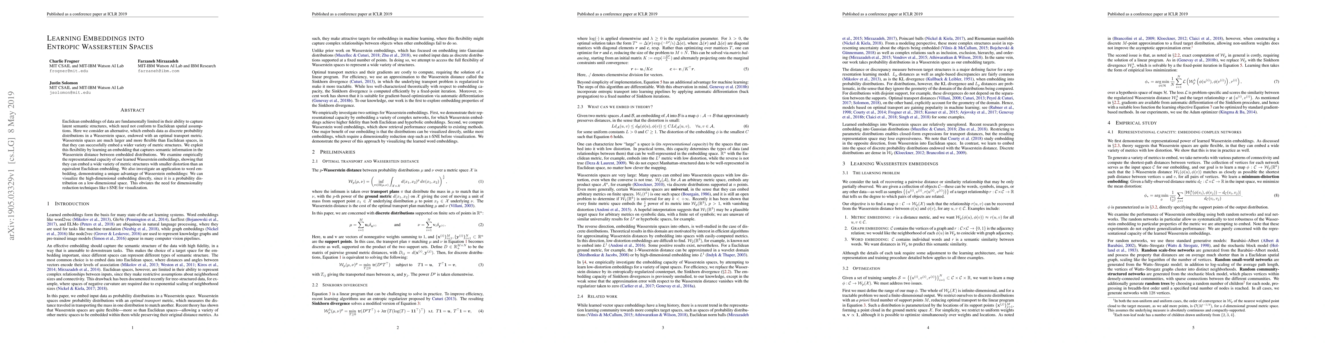 This paper proposes learning embeddings of data into entropic Wasserstein spaces to capture latent semantic structures, showing they outperform Euclidean embeddings by embedding a broader variety of metric structures with less distortion. It demonstrates a practical application in word embedding, where Wasserstein embeddings allow direct visualization without dimensionality reduction.