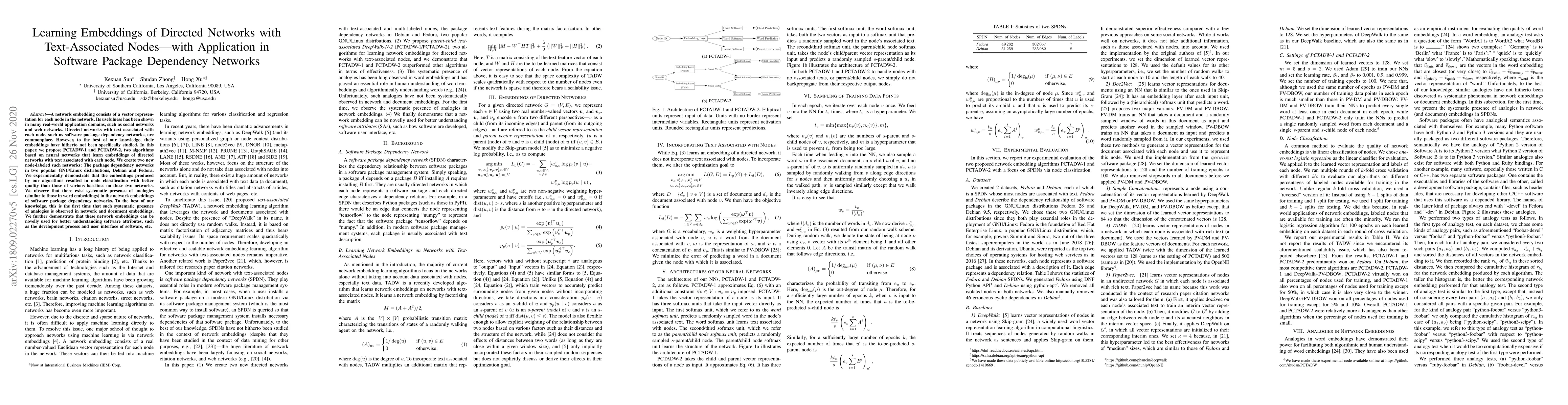 This paper proposes two neural network-based algorithms, PCTADW-1 and PCTADW-2, to learn embeddings for directed networks with text-associated nodes, specifically applied to software package dependency networks. The study demonstrates superior node classification performance and reveals systematic analogies in the embeddings, offering insights into software attributes.