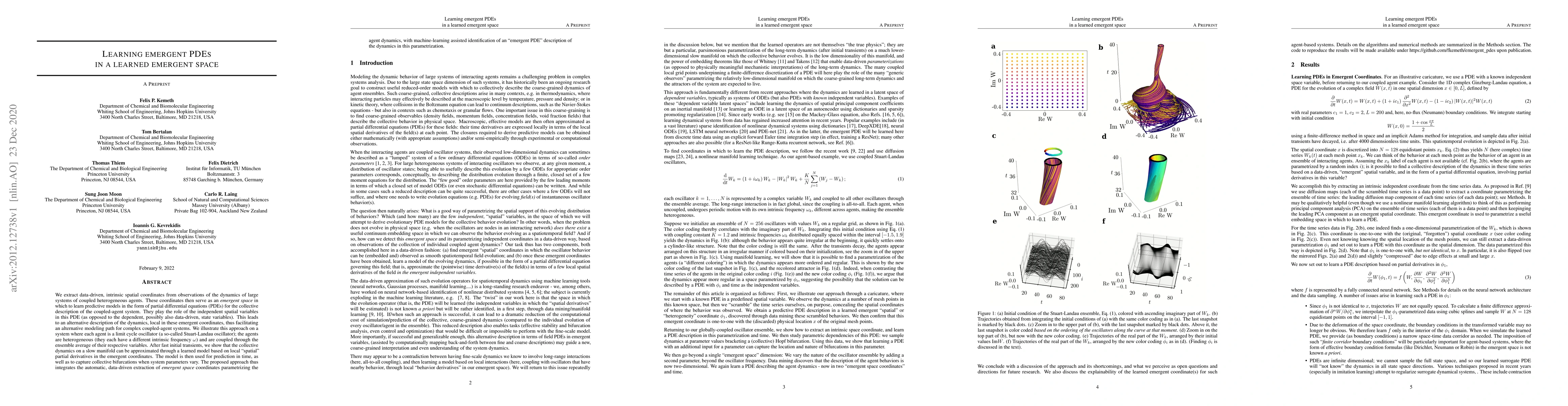 This paper proposes a method to learn predictive models in the form of partial differential equations (PDEs) from large systems of coupled heterogeneous agents by extracting intrinsic spatial coordinates from their dynamics. These coordinates serve as an emergent space, facilitating a local modeling approach that captures collective dynamics and bifurcations.