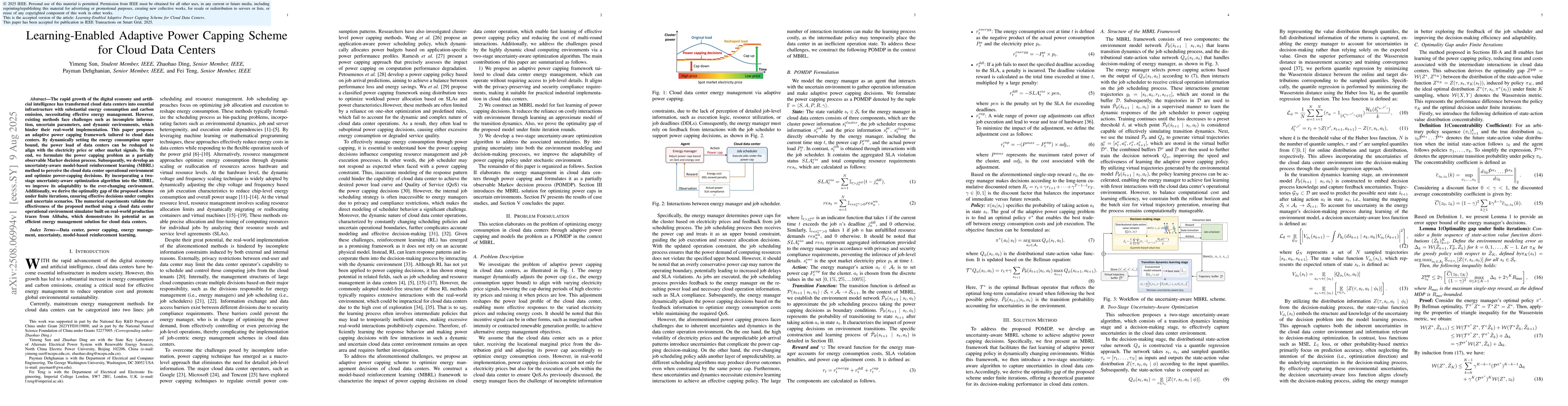 The paper proposes an adaptive power capping framework for cloud data centers, formulated as a Partially Observable Markov Decision Process (POMDP). It introduces an uncertainty-aware Model-Based Reinforcement Learning (MBRL) method to optimize power-capping decisions, incorporating a two-stage uncertainty-aware optimization algorithm for adaptability in dynamic environments.