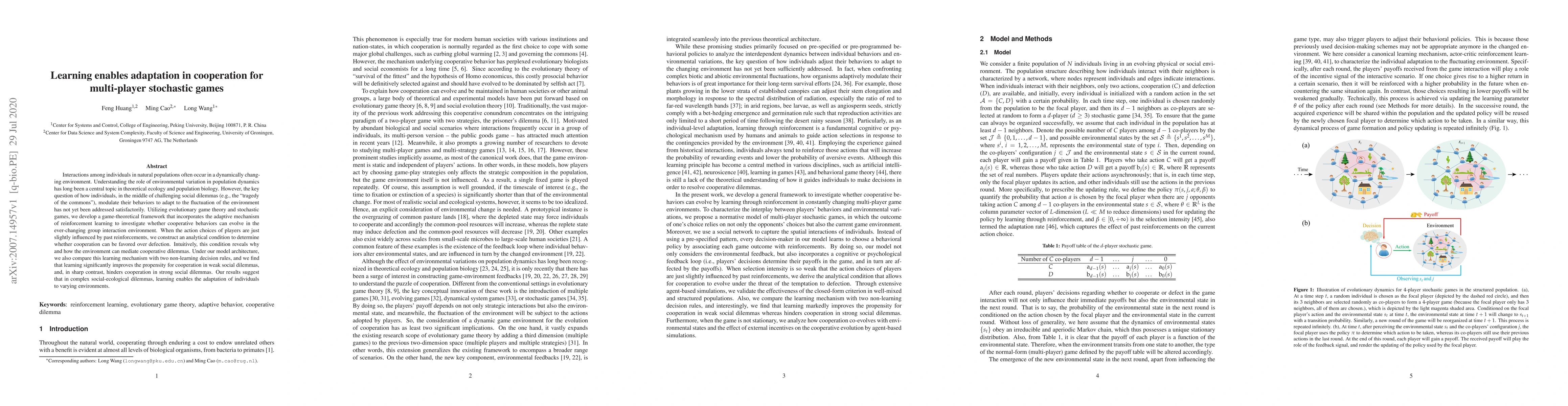 The research employs evolutionary game theory and reinforcement learning to model cooperative behavior in multi-player stochastic games, incorporating an adaptive mechanism to analyze the evolution of cooperation in fluctuating environments.