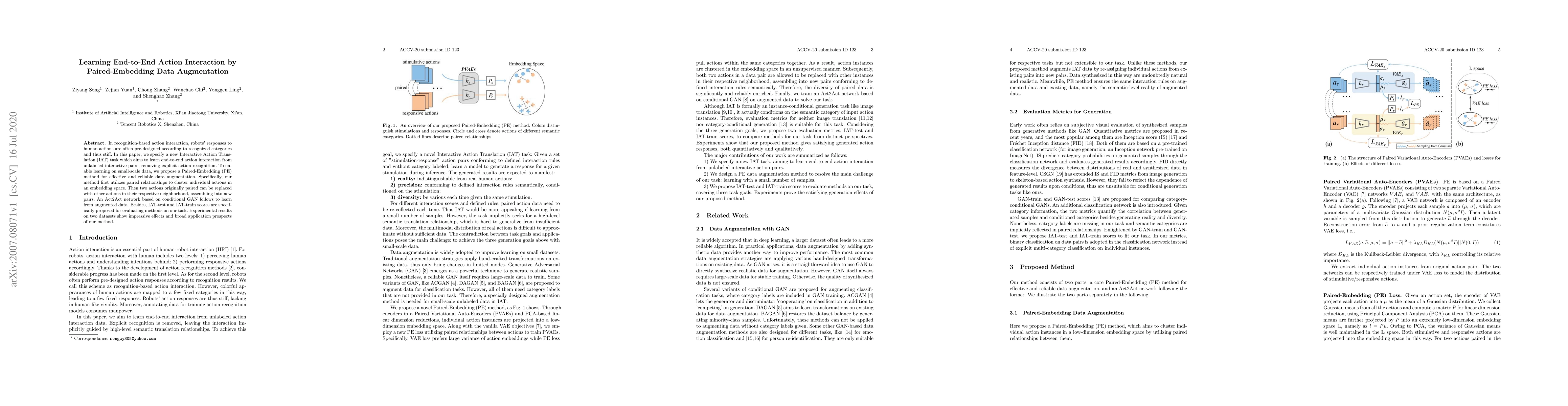 This paper introduces an Interactive Action Translation (IAT) task to learn end-to-end action interaction without explicit recognition, proposing a Paired-Embedding method for data augmentation. The method clusters actions in an embedding space and generates new pairs through neighborhood replacements, followed by training with an Act2Act network based on conditional GAN, demonstrating effective learning on small-scale data.