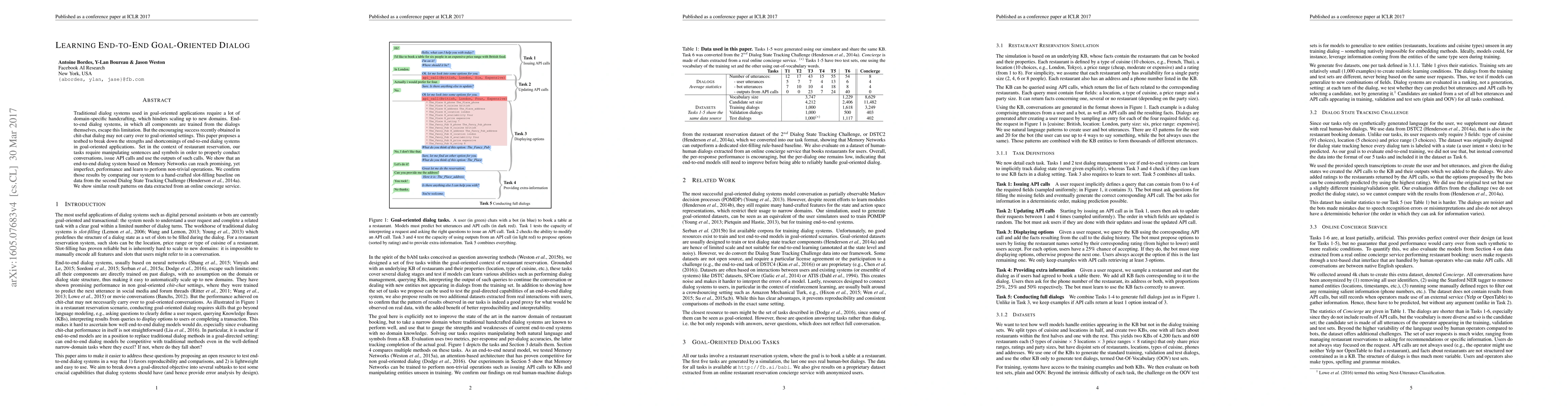 This paper introduces an end-to-end goal-oriented dialog system using Memory Networks to tackle restaurant reservation tasks, demonstrating promising performance compared to a hand-crafted baseline, though it still shows room for improvement. The study evaluates the system on datasets from the Dialog State Tracking Challenge and an online concierge service.