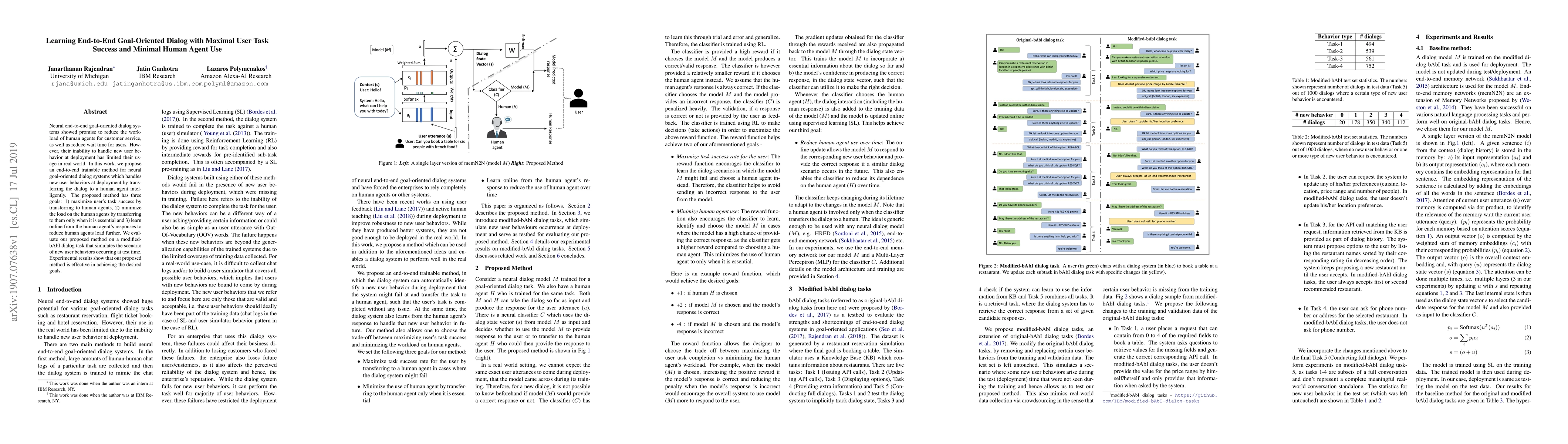 This research proposes a trainable neural method for goal-oriented dialog systems that adapts to new user behaviors by intelligently transferring tasks to human agents. The method aims to maximize user task success, minimize human agent workload, and learn from agent responses to reduce future load, demonstrating effectiveness in simulated scenarios.
