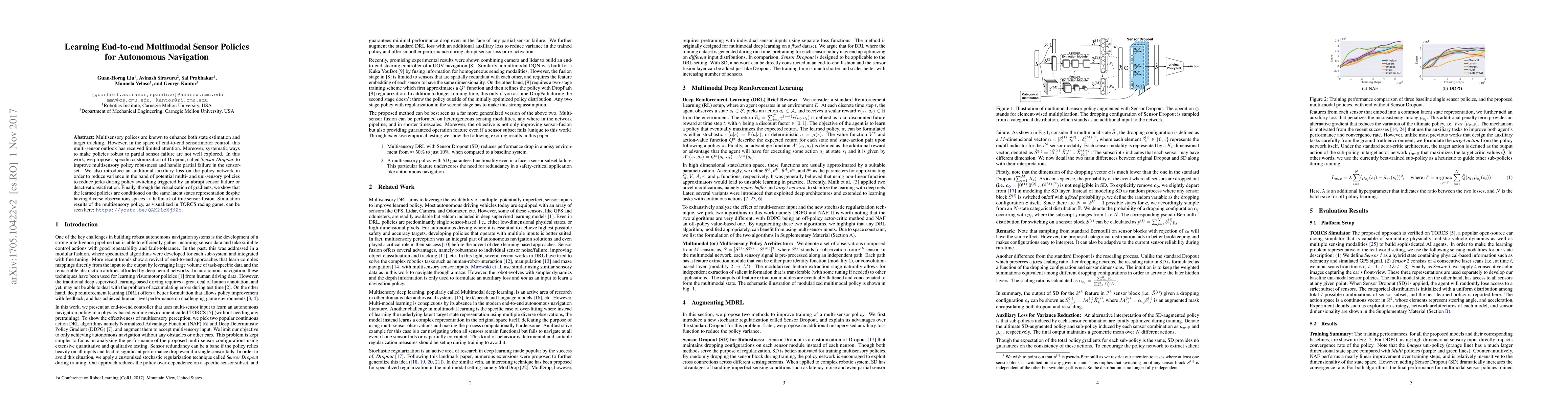 This paper proposes a novel approach to develop robust end-to-end multimodal sensor policies for autonomous navigation using a customized Dropout technique called Sensor Dropout and an auxiliary loss to handle partial sensor failure and reduce policy switching jerks. The study demonstrates effective sensor fusion through gradient visualization and showcases simulation results in a TORCS racing game.