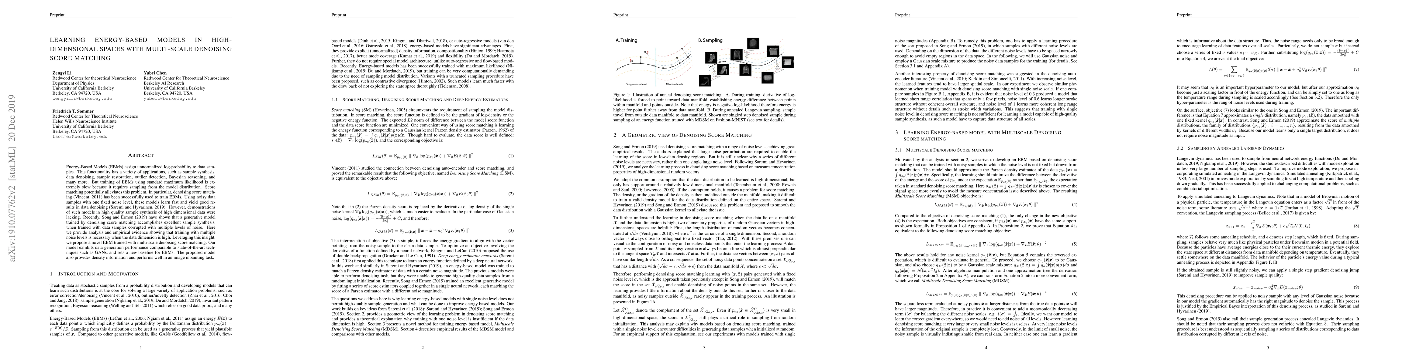 This paper proposes a novel Energy-Based Model (EBM) trained with multi-scale denoising score matching to achieve high-quality sample synthesis in high-dimensional spaces. The model demonstrates performance comparable to state-of-the-art GANs and sets a new baseline for EBMs, while also providing density information and excelling in image inpainting tasks.