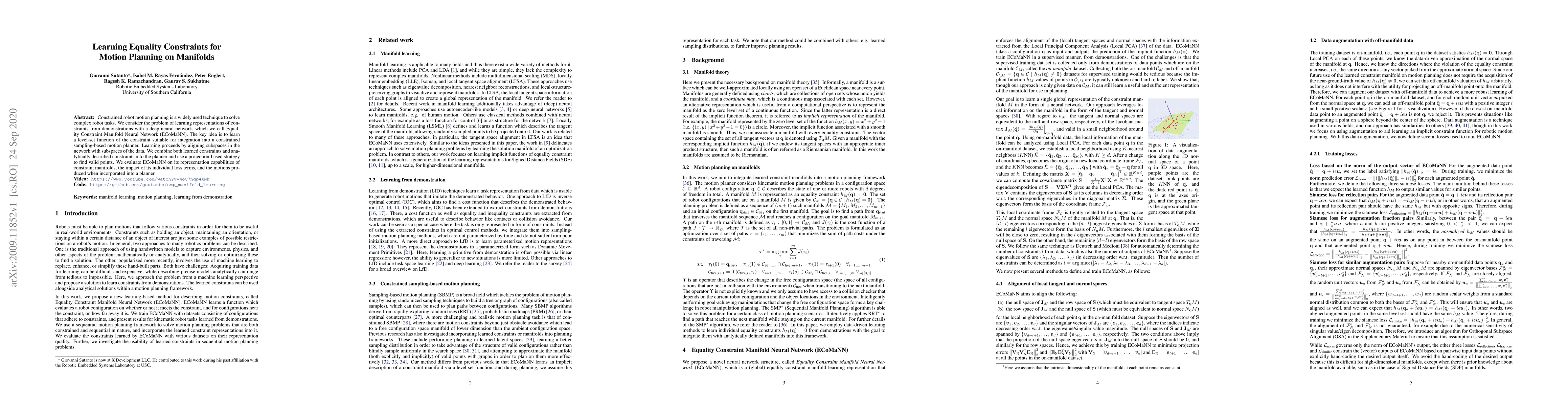 The Equality Constraint Manifold Neural Network (ECoMaNN) is introduced, which learns approximate normal and tangent spaces of underlying manifolds suitable for constrained sampling-based motion planning.