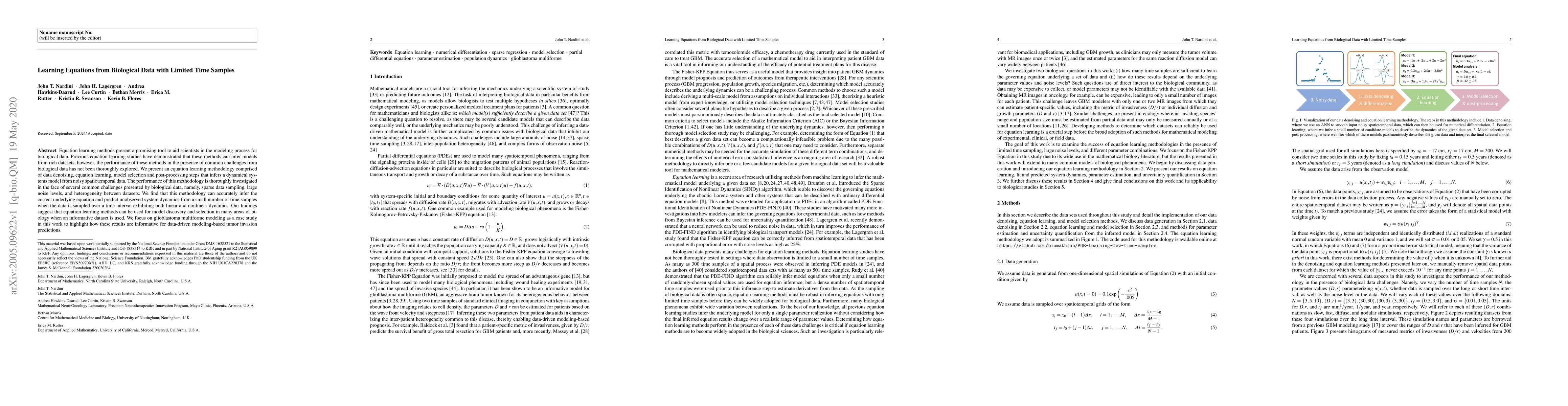 Equation learning methods present a promising tool to aid scientists in the modeling process for biological data. Previous equation learning studies have demonstrated that these methods can infer models from rich datasets, however, the performance of these methods in the presence of common challenges from biological data has not been thoroughly explored. We present an equation learning methodology comprised of data denoising, equation learning, model selection and post-processing steps that infers a dynamical systems model from noisy spatiotemporal data. The performance of this methodology is thoroughly investigated in the face of several common challenges presented by biological data, namely, sparse data sampling, large noise levels, and heterogeneity between datasets. We find that this methodology can accurately infer the correct underlying equation and predict unobserved system dynamics from a small number of time samples when the data is sampled over a time interval exhibiting both linear and nonlinear dynamics. Our findings suggest that equation learning methods can be used for model discovery and selection in many areas of biology when an informative dataset is used. We focus on glioblastoma multiforme modeling as a case study in this work to highlight how these results are informative for data-driven modeling-based tumor invasion predictions.