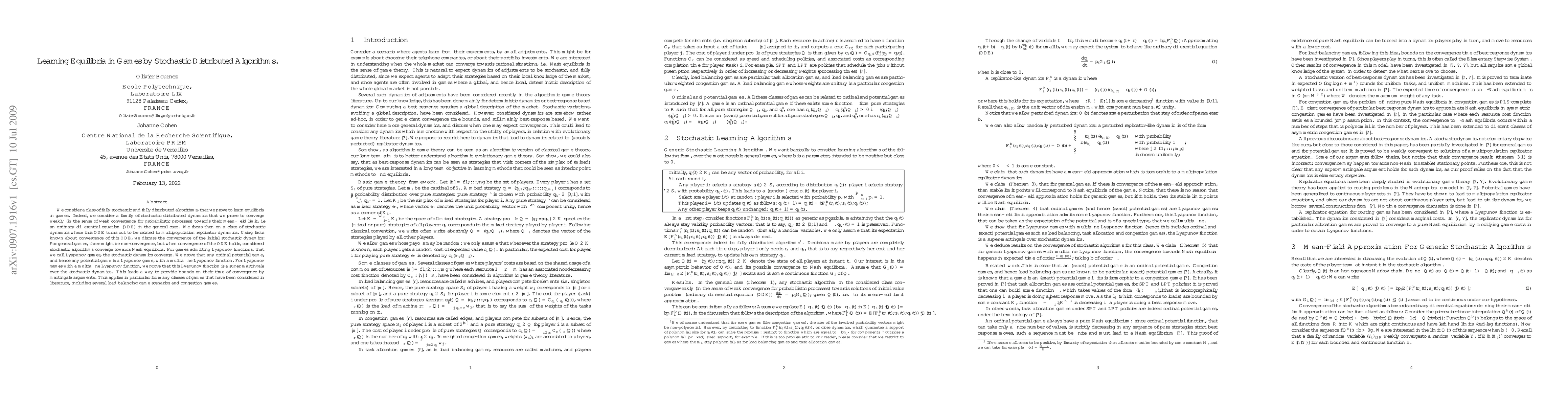 We consider a class of fully stochastic and fully distributed algorithms, that we prove to learn equilibria in games. Indeed, we consider a family of stochastic distributed dynamics that we prove to converge weakly (in the sense of weak convergence for probabilistic processes) towards their mean-field limit, i.e an ordinary differential equation (ODE) in the general case. We focus then on a class of stochastic dynamics where this ODE turns out to be related to multipopulation replicator dynamics. Using facts known about convergence of this ODE, we discuss the convergence of the initial stochastic dynamics: For general games, there might be non-convergence, but when convergence of the ODE holds, considered stochastic algorithms converge towards Nash equilibria. For games admitting Lyapunov functions, that we call Lyapunov games, the stochastic dynamics converge. We prove that any ordinal potential game, and hence any potential game is a Lyapunov game, with a multiaffine Lyapunov function. For Lyapunov games with a multiaffine Lyapunov function, we prove that this Lyapunov function is a super-martingale over the stochastic dynamics. This leads a way to provide bounds on their time of convergence by martingale arguments. This applies in particular for many classes of games that have been considered in literature, including several load balancing game scenarios and congestion games.