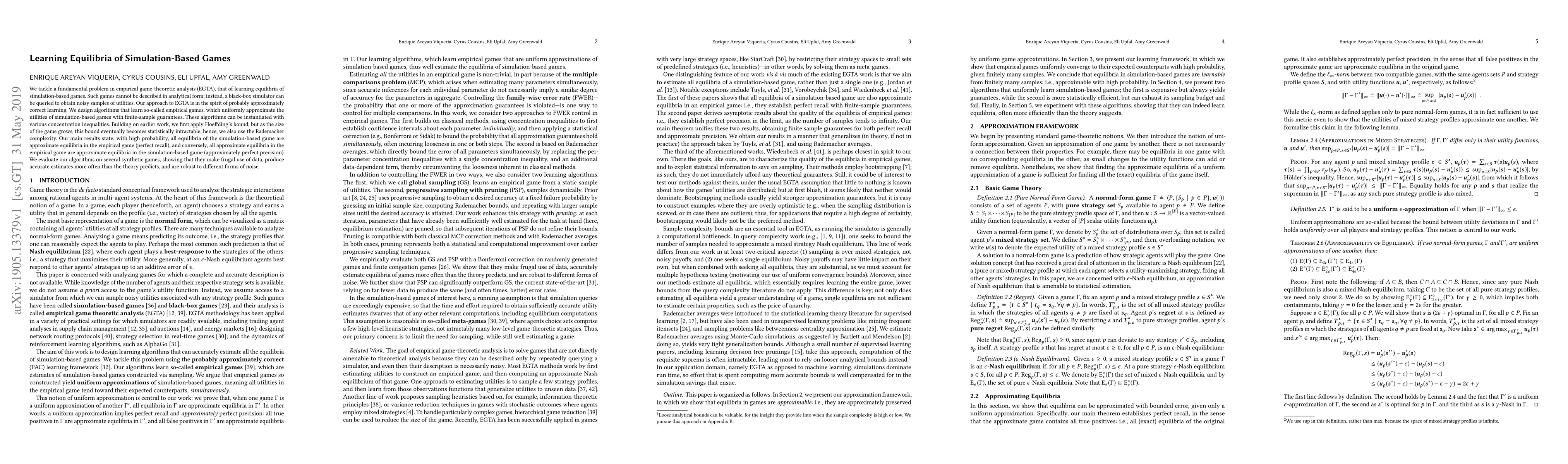 We tackle a fundamental problem in empirical game-theoretic analysis (EGTA), that of learning equilibria of simulation-based games. Such games cannot be described in analytical form; instead, a black-box simulator can be queried to obtain noisy samples of utilities. Our approach to EGTA is in the spirit of probably approximately correct learning. We design algorithms that learn so-called empirical games, which uniformly approximate the utilities of simulation-based games with finite-sample guarantees. These algorithms can be instantiated with various concentration inequalities. Building on earlier work, we first apply Hoeffding's bound, but as the size of the game grows, this bound eventually becomes statistically intractable; hence, we also use the Rademacher complexity. Our main results state: with high probability, all equilibria of the simulation-based game are approximate equilibria in the empirical game (perfect recall); and conversely, all approximate equilibria in the empirical game are approximate equilibria in the simulation-based game (approximately perfect precision). We evaluate our algorithms on several synthetic games, showing that they make frugal use of data, produce accurate estimates more often than the theory predicts, and are robust to different forms of noise.