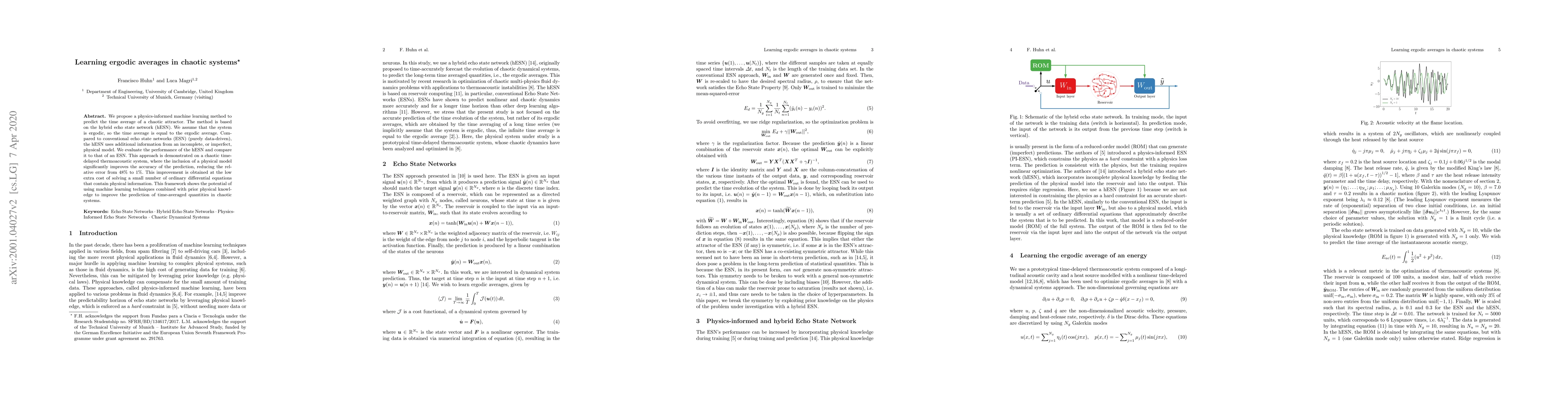 We propose a physics-informed machine learning method to predict the time average of a chaotic attractor. The method is based on the hybrid echo state network (hESN). We assume that the system is ergodic, so the time average is equal to the ergodic average. Compared to conventional echo state networks (ESN) (purely data-driven), the hESN uses additional information from an incomplete, or imperfect, physical model. We evaluate the performance of the hESN and compare it to that of an ESN. This approach is demonstrated on a chaotic time-delayed thermoacoustic system, where the inclusion of a physical model significantly improves the accuracy of the prediction, reducing the relative error from 48% to 7%. This improvement is obtained at the low extra cost of solving two ordinary differential equations. This framework shows the potential of using machine learning techniques combined with prior physical knowledge to improve the prediction of time-averaged quantities in chaotic systems.