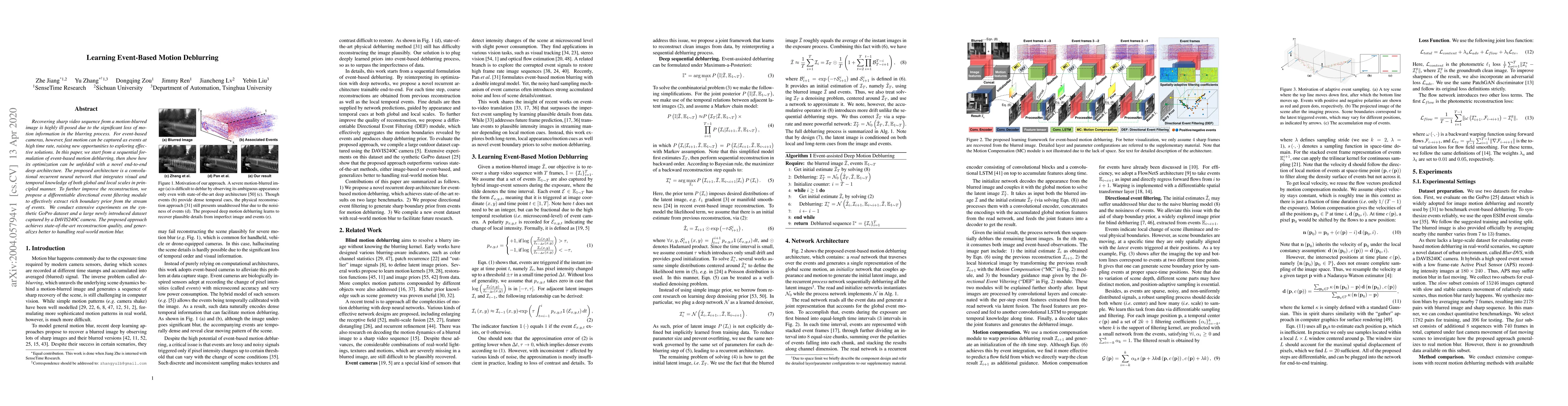 This paper proposes a convolutional recurrent neural network for event-based motion deblurring, integrating visual and temporal knowledge to reconstruct sharp video sequences from motion-blurred images. The approach includes a differentiable directional event filtering module for boundary prior extraction, achieving state-of-the-art results on synthetic and real datasets.