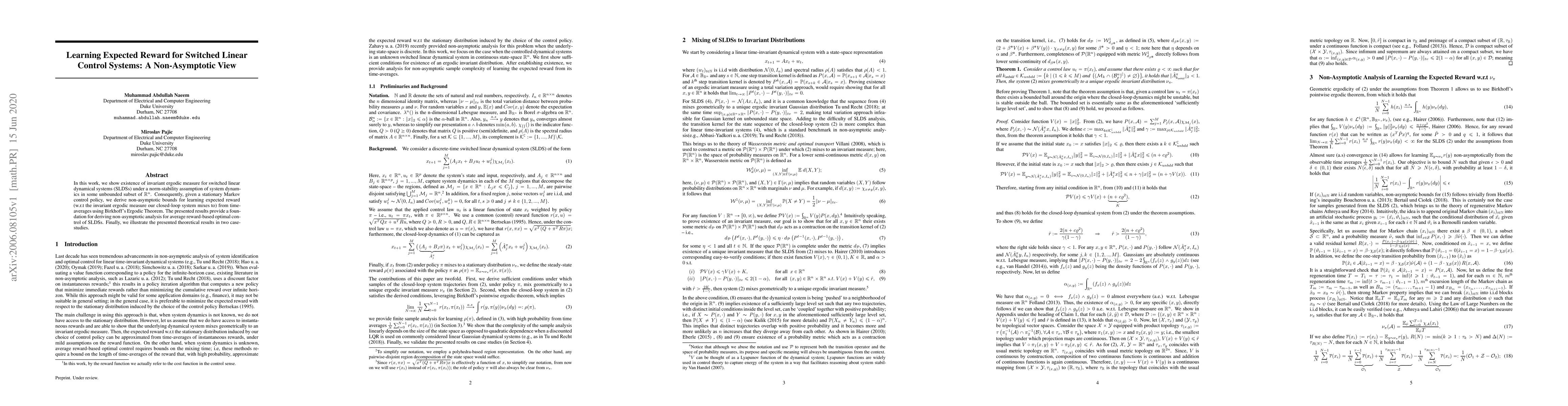 In this work, we show existence of invariant ergodic measure for switched linear dynamical systems (SLDSs) under a norm-stability assumption of system dynamics in some unbounded subset of $\mathbb{R}^{n}$. Consequently, given a stationary Markov control policy, we derive non-asymptotic bounds for learning expected reward (w.r.t the invariant ergodic measure our closed-loop system mixes to) from time-averages using Birkhoff's Ergodic Theorem. The presented results provide a foundation for deriving non-asymptotic analysis for average reward-based optimal control of SLDSs. Finally, we illustrate the presented theoretical results in two case-studies.