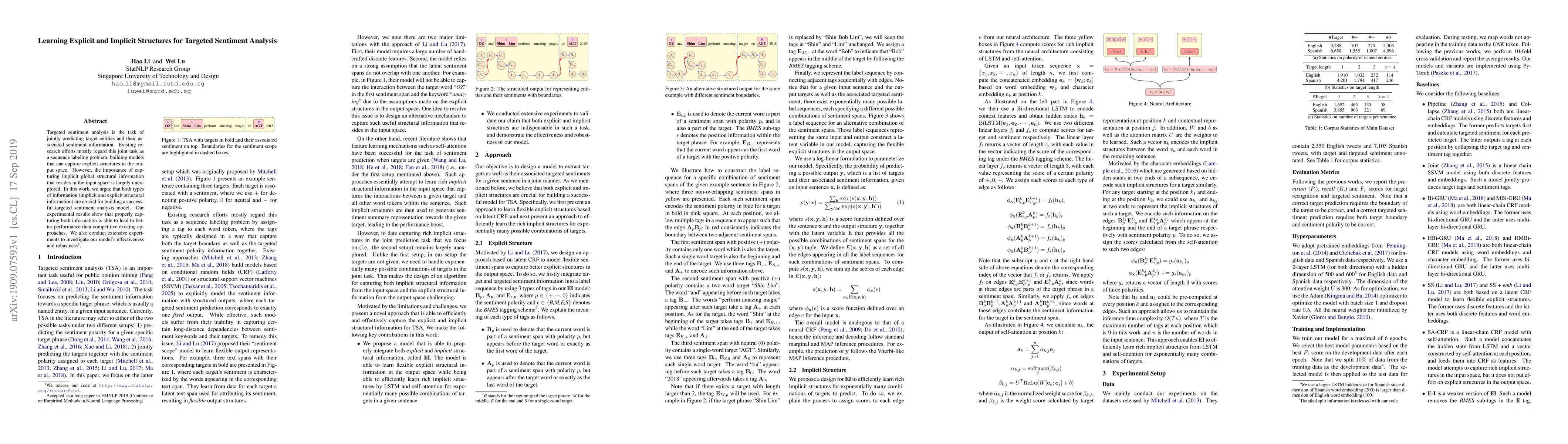 Targeted sentiment analysis is the task of jointly predicting target entities and their associated sentiment information. Existing research efforts mostly regard this joint task as a sequence labeling problem, building models that can capture explicit structures in the output space. However, the importance of capturing implicit global structural information that resides in the input space is largely unexplored. In this work, we argue that both types of information (implicit and explicit structural information) are crucial for building a successful targeted sentiment analysis model. Our experimental results show that properly capturing both information is able to lead to better performance than competitive existing approaches. We also conduct extensive experiments to investigate our model's effectiveness and robustness.