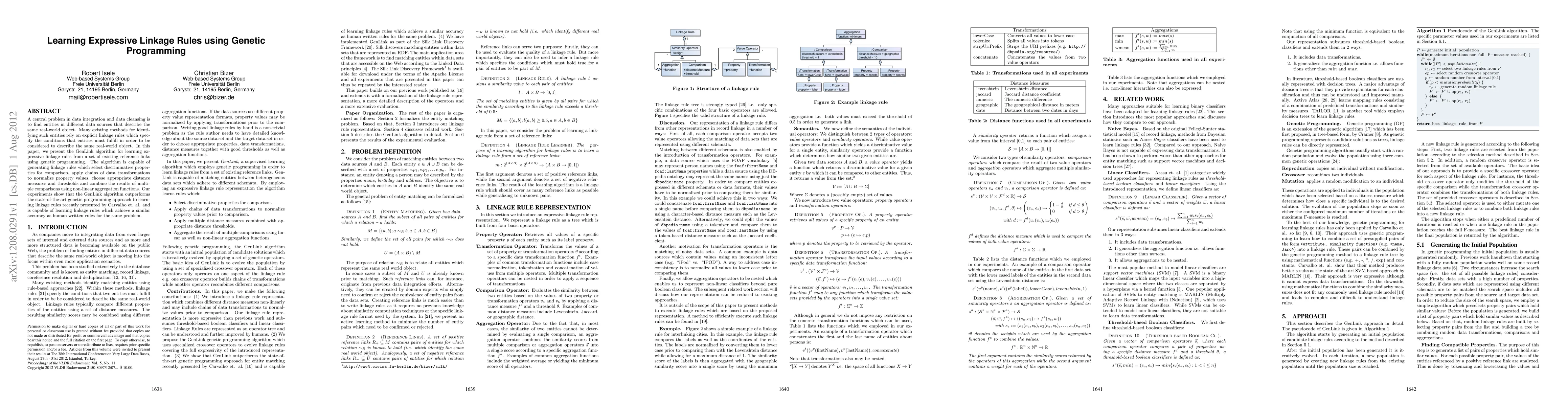 This paper introduces the GenLink algorithm, which uses genetic programming to learn expressive linkage rules for data integration, outperforming existing methods and achieving accuracy comparable to human-written rules. The algorithm generates rules that incorporate property comparisons, data transformations, distance measures, and non-linear aggregation functions.