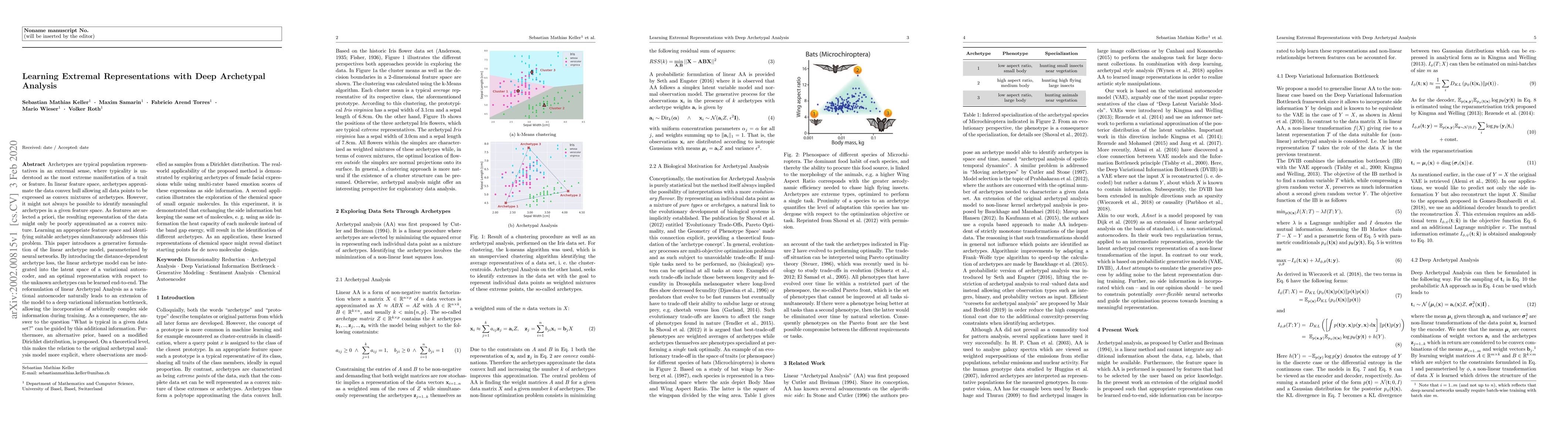 Archetypes are typical population representatives in an extremal sense, where typicality is understood as the most extreme manifestation of a trait or feature. In linear feature space, archetypes approximate the data convex hull allowing all data points to be expressed as convex mixtures of archetypes. However, it might not always be possible to identify meaningful archetypes in a given feature space. Learning an appropriate feature space and identifying suitable archetypes simultaneously addresses this problem. This paper introduces a generative formulation of the linear archetype model, parameterized by neural networks. By introducing the distance-dependent archetype loss, the linear archetype model can be integrated into the latent space of a variational autoencoder, and an optimal representation with respect to the unknown archetypes can be learned end-to-end. The reformulation of linear Archetypal Analysis as deep variational information bottleneck, allows the incorporation of arbitrarily complex side information during training. Furthermore, an alternative prior, based on a modified Dirichlet distribution, is proposed. The real-world applicability of the proposed method is demonstrated by exploring archetypes of female facial expressions while using multi-rater based emotion scores of these expressions as side information. A second application illustrates the exploration of the chemical space of small organic molecules. In this experiment, it is demonstrated that exchanging the side information but keeping the same set of molecules, e. g. using as side information the heat capacity of each molecule instead of the band gap energy, will result in the identification of different archetypes. As an application, these learned representations of chemical space might reveal distinct starting points for de novo molecular design.
