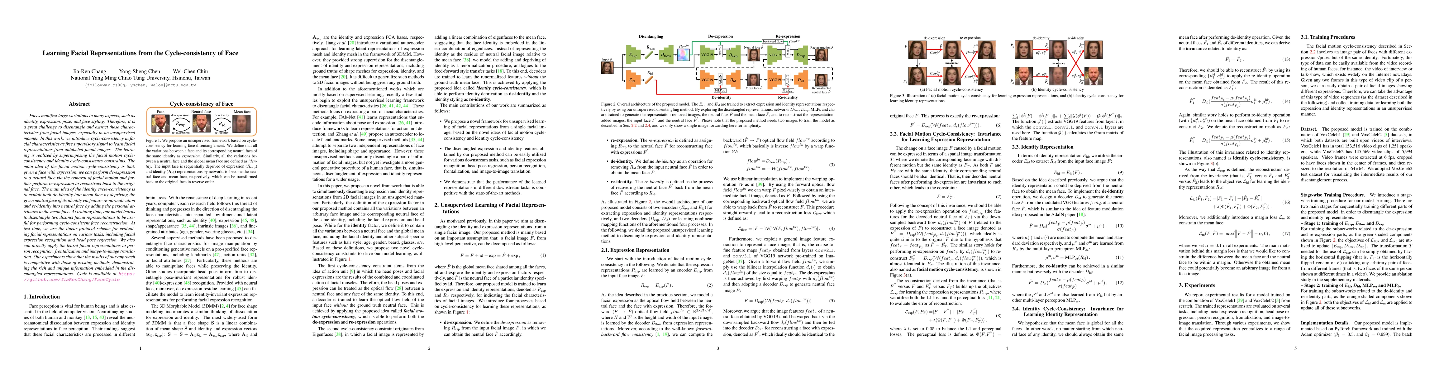 This paper proposes an unsupervised method to learn facial representations using cycle-consistency constraints, specifically facial motion and identity cycle-consistency. The approach disentangles facial characteristics for face reconstruction, expression recognition, and person recognition, achieving competitive results with existing methods.
