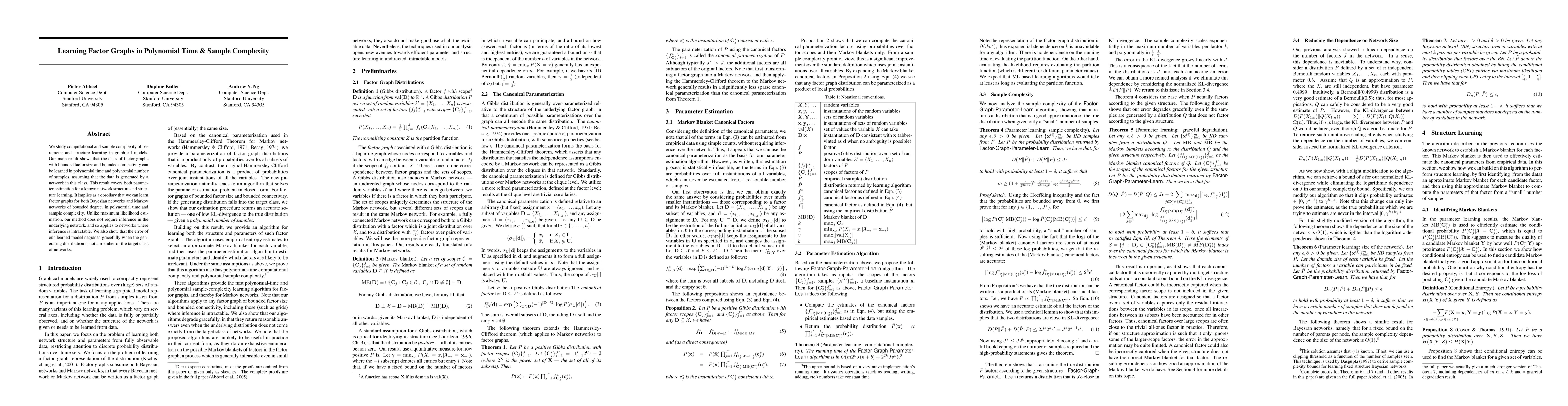 This paper demonstrates polynomial-time and sample complexity for learning factor graphs with bounded factor size and connectivity, applicable to both Bayesian and Markov networks. Unlike maximum likelihood, the method does not require network inference, making it suitable for intractable networks, and shows graceful error degradation when the data deviates from the target class.