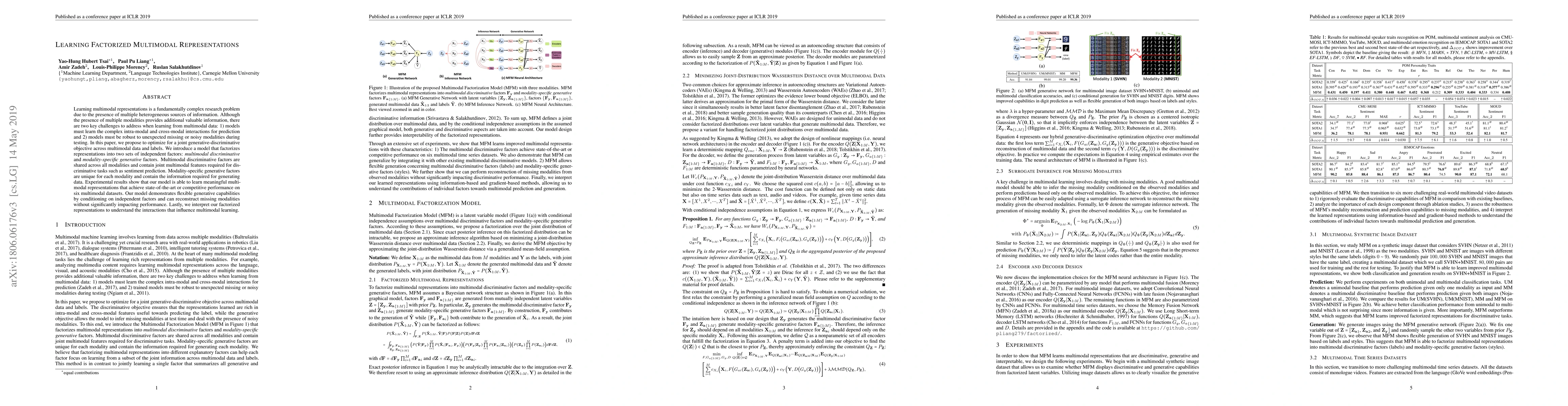 This paper proposes a model to learn factorized multimodal representations by optimizing a joint generative-discriminative objective across different data sources. The model separates representations into shared discriminative and modality-specific generative factors, achieving state-of-the-art performance on various datasets and demonstrating robustness to missing or noisy modalities.