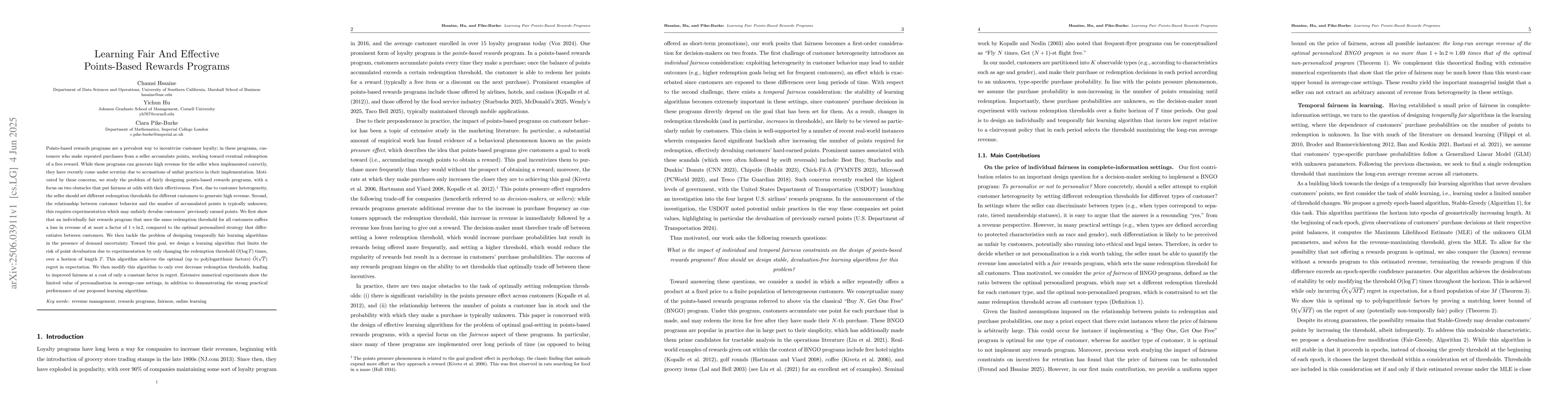 A research paper investigates the design of fair and effective points-based rewards programs, finding that personalized strategies outperform uniform ones with a revenue loss of at most 1+ ln 2; it also proposes learning algorithms to minimize point devaluation and improve fairness while maintaining low regret.