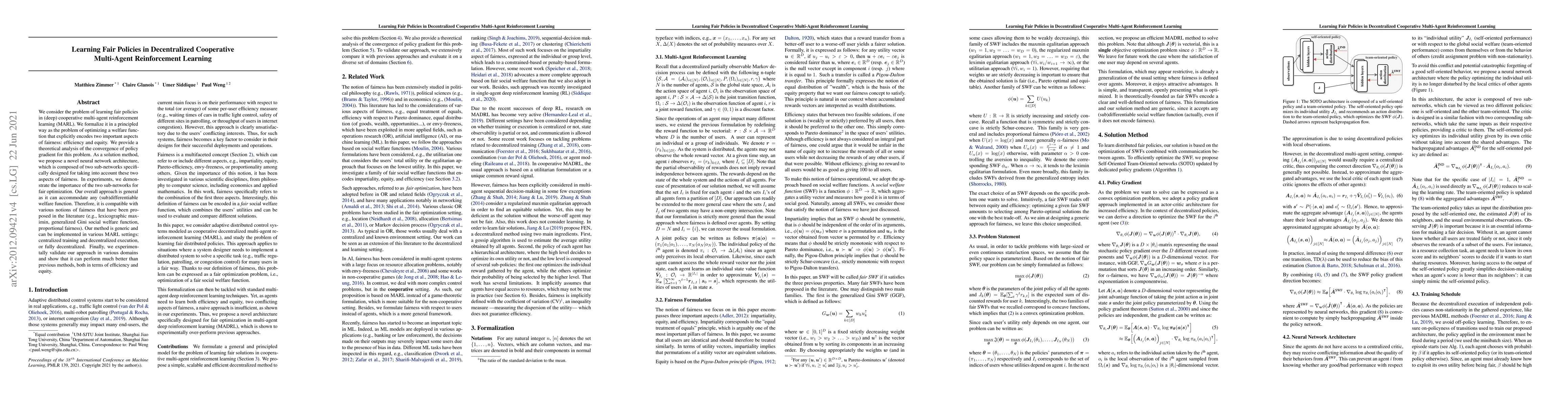 This paper proposes a novel neural network architecture for learning fair policies in cooperative multi-agent reinforcement learning, focusing on optimizing a welfare function that balances efficiency and equity. The approach is shown to outperform previous methods in various MARL settings and domains.