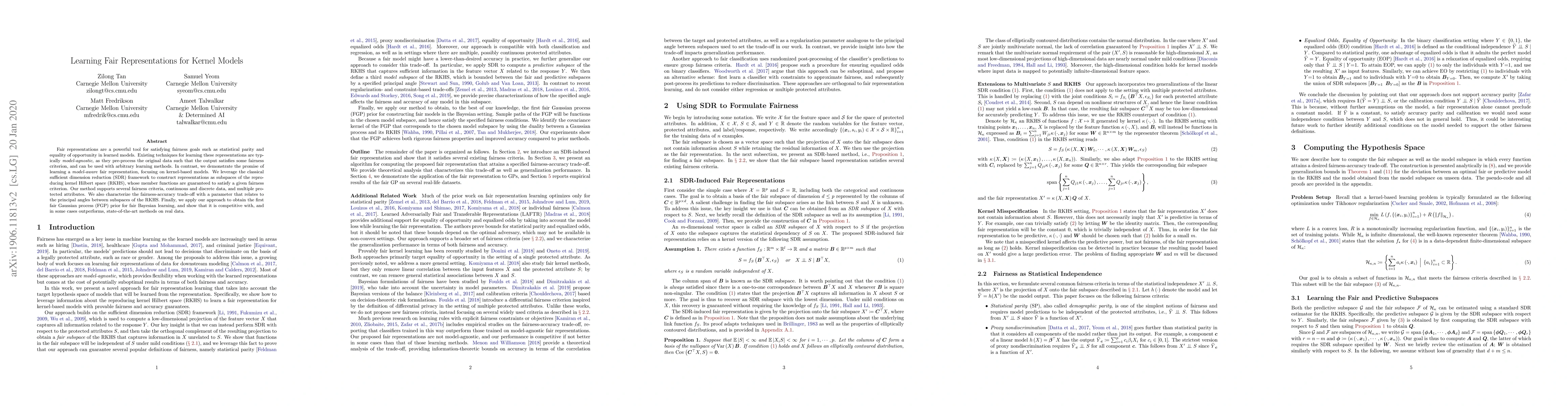 The paper proposes a method for learning fair representations specifically for kernel models, leveraging the Sufficient Dimension Reduction (SDR) framework to construct representations as subspaces of the Reproducing Kernel Hilbert Space (RKHS). The method supports various fairness criteria and handles both continuous and discrete data with multiple protected attributes.
