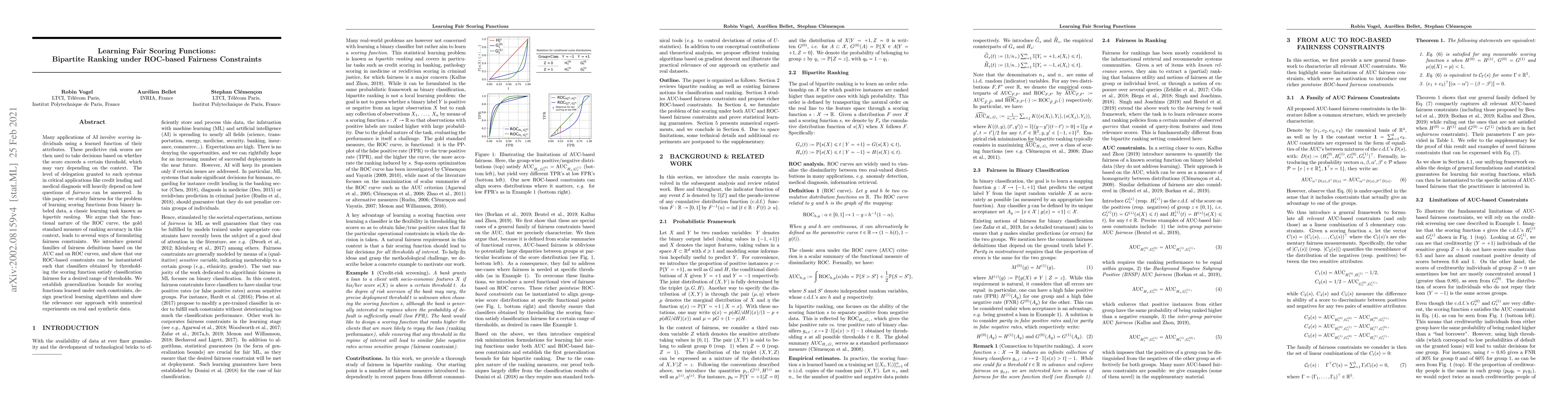 This paper explores learning fair scoring functions for bipartite ranking under ROC-based fairness constraints, introducing general fairness definitions based on AUC and ROC curves. It demonstrates how these constraints can ensure classification fairness across various thresholds and presents practical learning algorithms and generalization bounds.