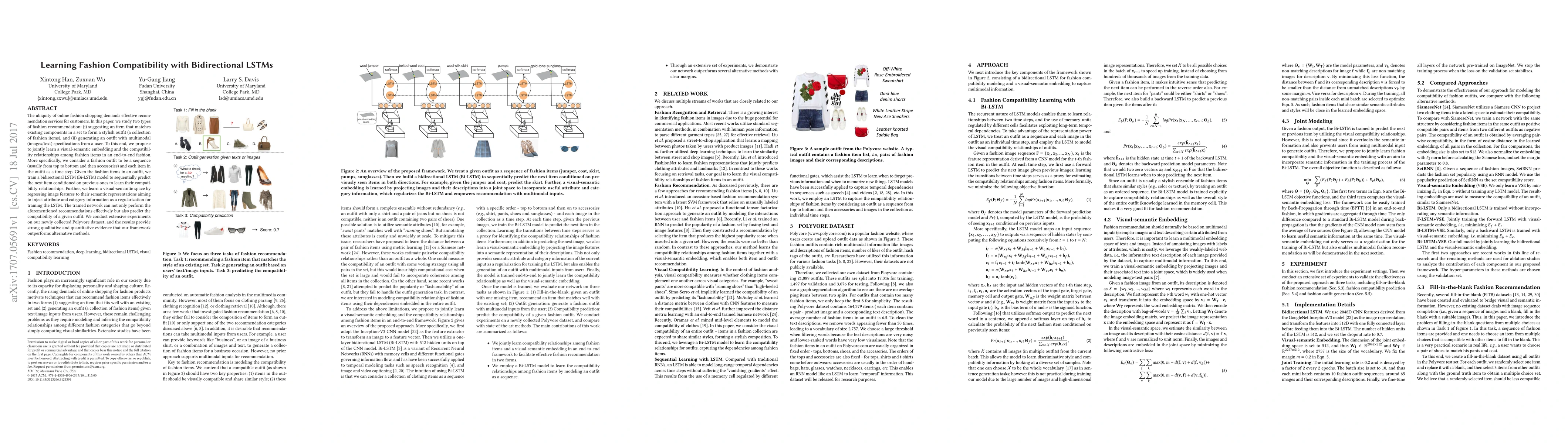 This paper proposes a bidirectional LSTM model to learn fashion item compatibility for outfit recommendations, using visual-semantic embeddings to enhance prediction accuracy. Experiments on a new Polyvore dataset show superior performance compared to alternative methods.