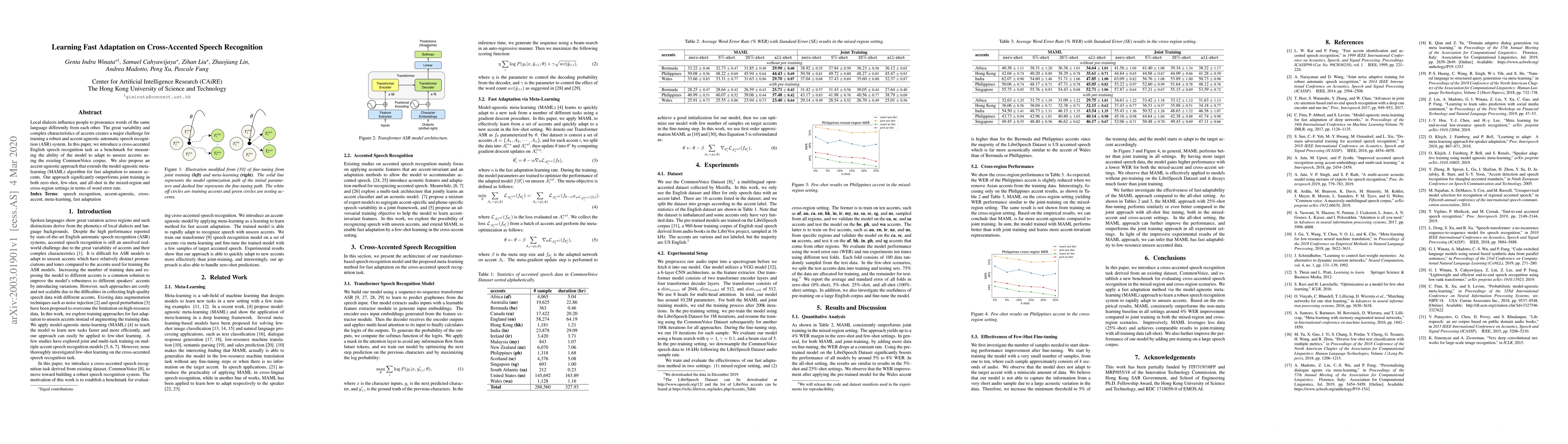 Local dialects influence people to pronounce words of the same language differently from each other. The great variability and complex characteristics of accents creates a major challenge for training a robust and accent-agnostic automatic speech recognition (ASR) system. In this paper, we introduce a cross-accented English speech recognition task as a benchmark for measuring the ability of the model to adapt to unseen accents using the existing CommonVoice corpus. We also propose an accent-agnostic approach that extends the model-agnostic meta-learning (MAML) algorithm for fast adaptation to unseen accents. Our approach significantly outperforms joint training in both zero-shot, few-shot, and all-shot in the mixed-region and cross-region settings in terms of word error rate.