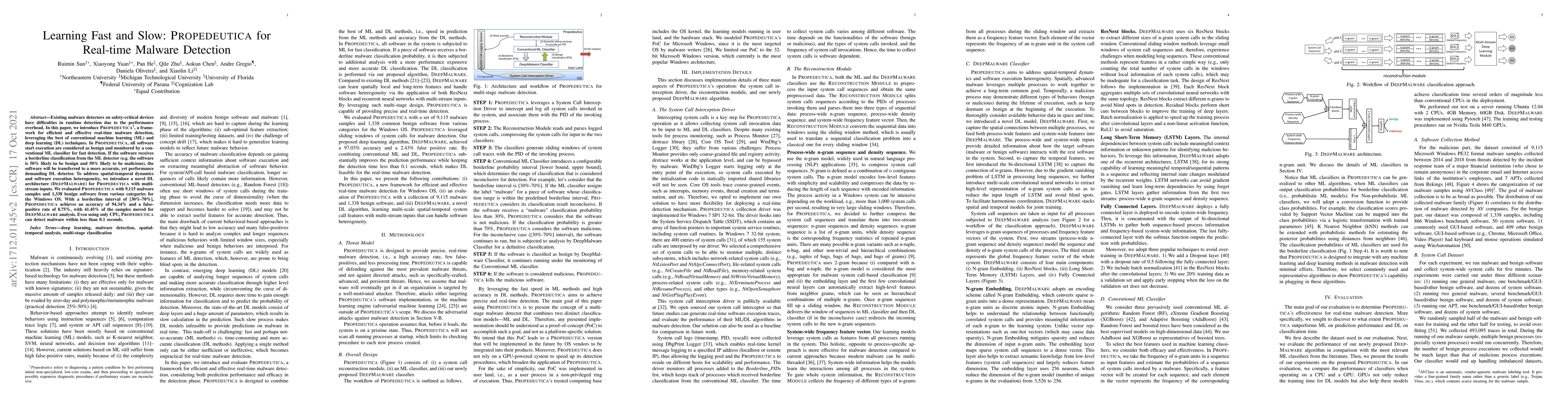Existing malware detectors on safety-critical devices have difficulties in runtime detection due to the performance overhead. In this paper, we introduce PROPEDEUTICA, a framework for efficient and effective real-time malware detection, leveraging the best of conventional machine learning (ML) and deep learning (DL) techniques. In PROPEDEUTICA, all software start execution are considered as benign and monitored by a conventional ML classifier for fast detection. If the software receives a borderline classification from the ML detector (e.g. the software is 50% likely to be benign and 50% likely to be malicious), the software will be transferred to a more accurate, yet performance demanding DL detector. To address spatial-temporal dynamics and software execution heterogeneity, we introduce a novel DL architecture (DEEPMALWARE) for PROPEDEUTICA with multi-stream inputs. We evaluated PROPEDEUTICA with 9,115 malware samples and 1,338 benign software from various categories for the Windows OS. With a borderline interval of [30%-70%], PROPEDEUTICA achieves an accuracy of 94.34% and a false-positive rate of 8.75%, with 41.45% of the samples moved for DEEPMALWARE analysis. Even using only CPU, PROPEDEUTICA can detect malware within less than 0.1 seconds.