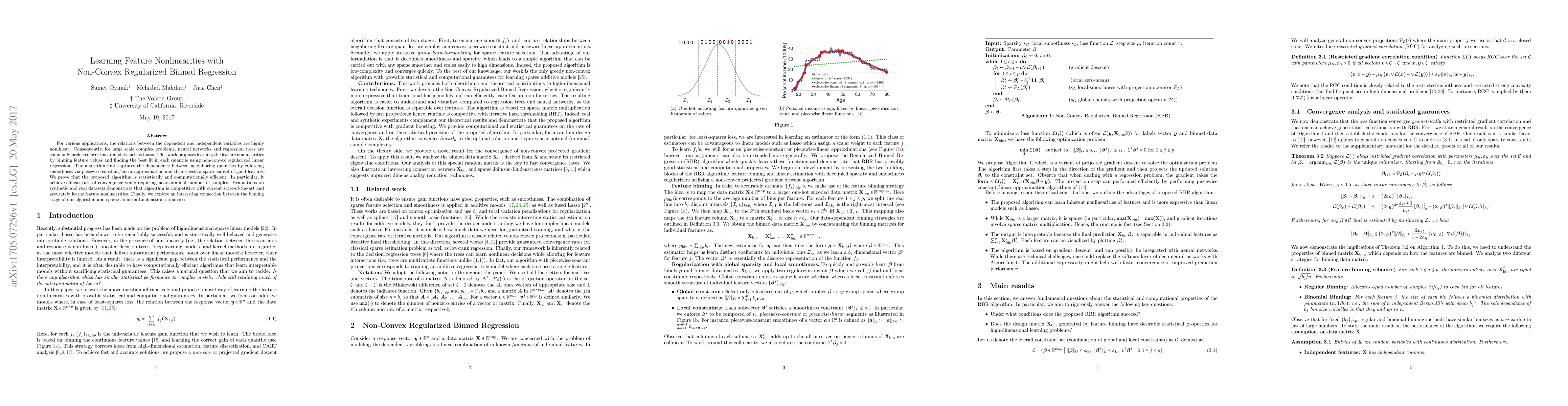 This paper proposes a non-convex regularized binned regression approach to learn feature nonlinearities by binning feature values and fitting linear regression in each quantile. The method is statistically and computationally efficient, achieving linear convergence and requiring minimal samples, and is competitive with state-of-the-art methods on both synthetic and real datasets.