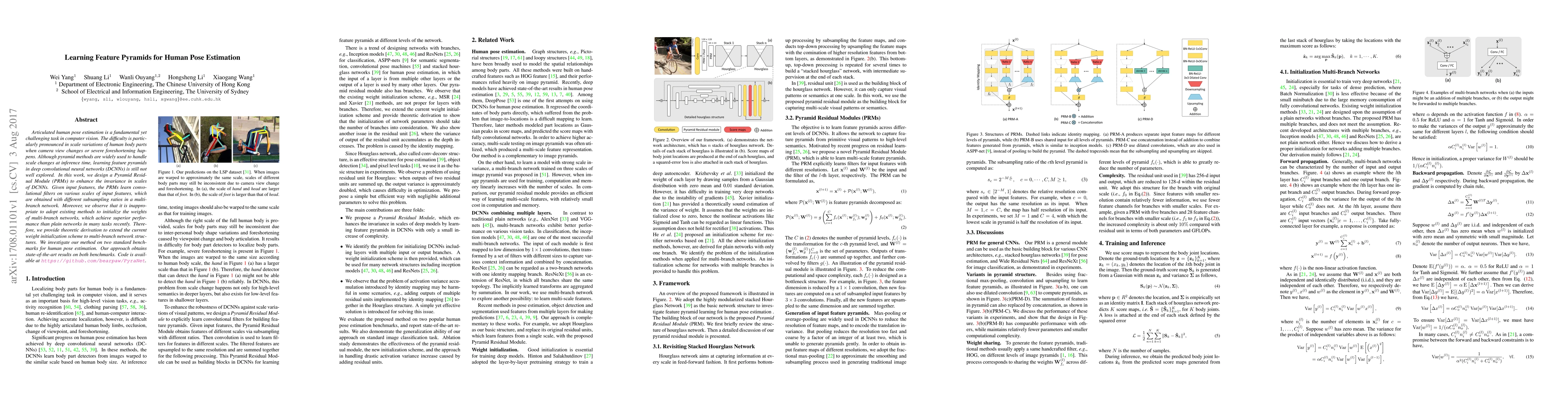 This paper proposes a Pyramid Residual Module (PRMs) to enhance scale invariance in deep convolutional neural networks for human pose estimation. The PRMs learn convolutional filters on various scales, and the authors provide a theoretical derivation for initializing weights in multi-branch networks, achieving state-of-the-art results on two benchmarks.