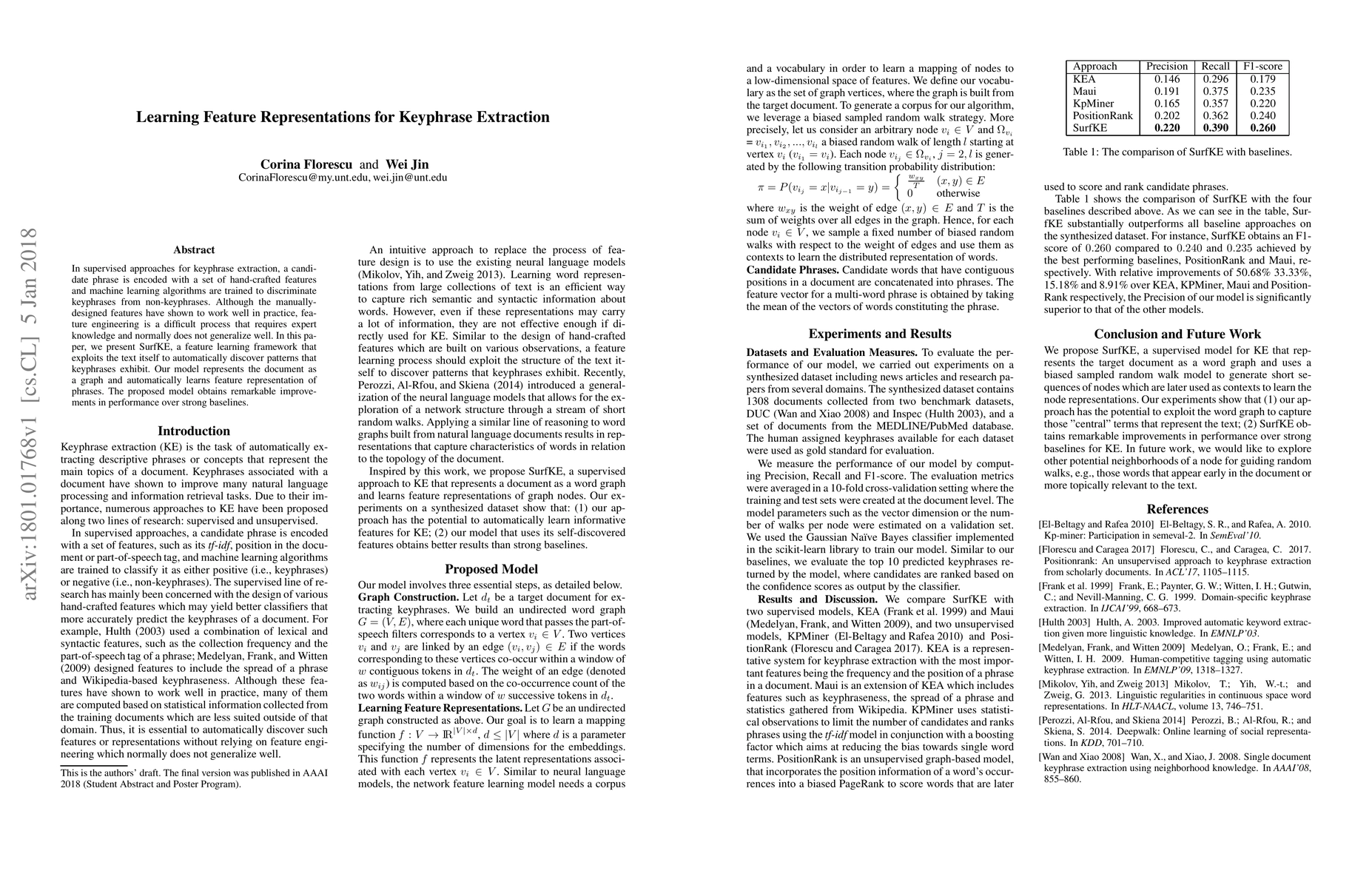 This paper introduces SurfKE, a feature learning framework that automatically discovers keyphrase patterns from text, eliminating the need for manual feature engineering. The model represents documents as graphs and learns phrase representations, achieving superior performance compared to traditional supervised methods.