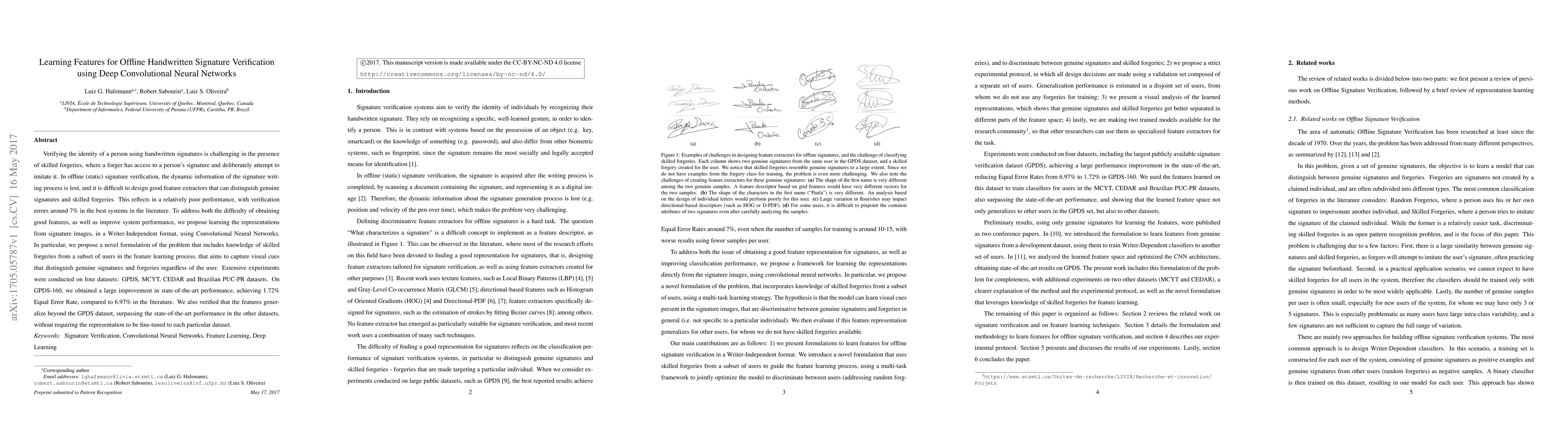 This paper proposes a deep convolutional neural network approach to improve offline handwritten signature verification by learning robust feature representations from signature images in a writer-independent format. The method achieves a significant reduction in Equal Error Rate, achieving 1.72% on GPDS-160, outperforming previous state-of-the-art methods by a large margin.