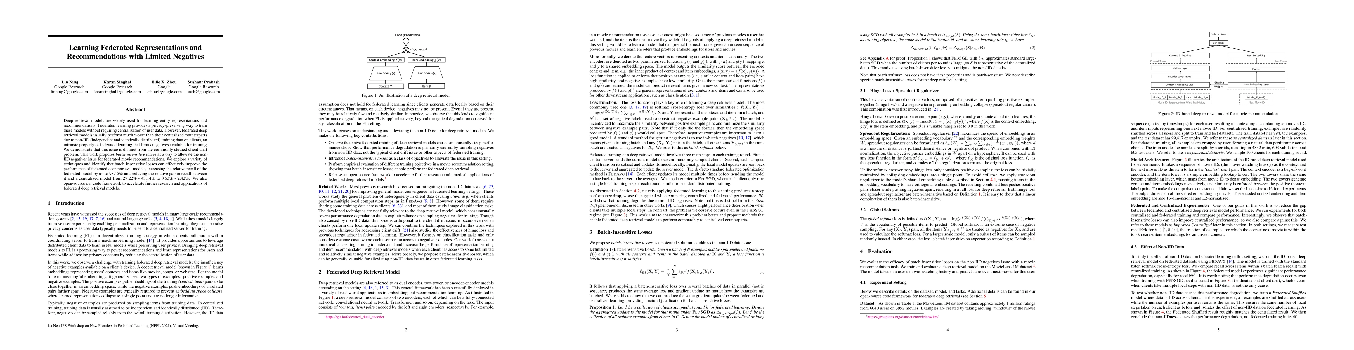 Deep retrieval models are widely used for learning entity representations and recommendations. Federated learning provides a privacy-preserving way to train these models without requiring centralization of user data. However, federated deep retrieval models usually perform much worse than their centralized counterparts due to non-IID (independent and identically distributed) training data on clients, an intrinsic property of federated learning that limits negatives available for training. We demonstrate that this issue is distinct from the commonly studied client drift problem. This work proposes batch-insensitive losses as a way to alleviate the non-IID negatives issue for federated movie recommendations. We explore a variety of techniques and identify that batch-insensitive losses can effectively improve the performance of federated deep retrieval models, increasing the relative recall of the federated model by up to 93.15% and reducing the relative gap in recall between it and a centralized model from 27.22% - 43.14% to 0.53% - 2.42%. We also open-source our code framework to accelerate further research and applications of federated deep retrieval models.