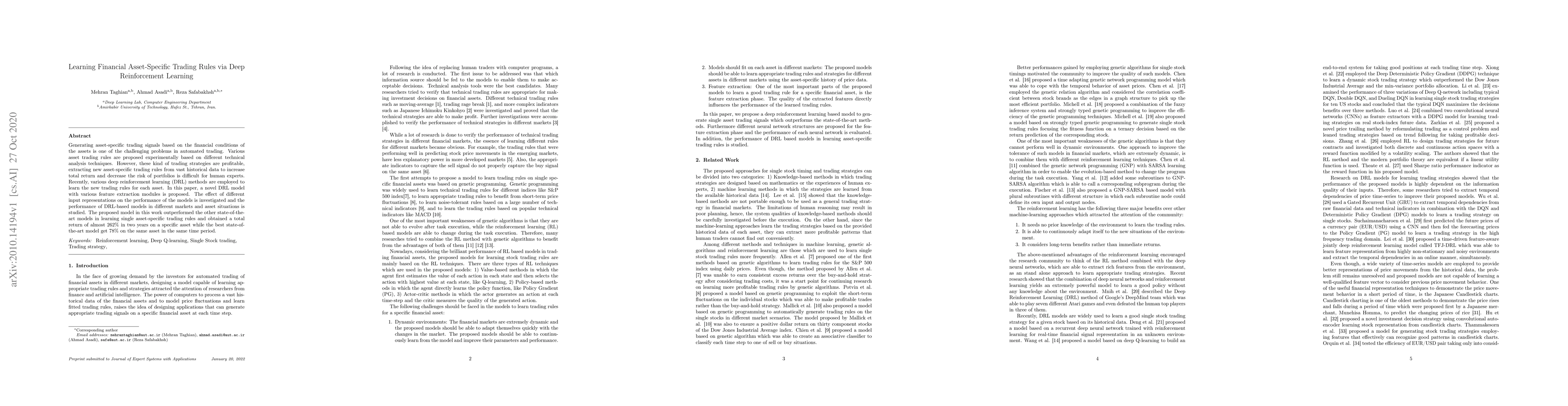 Generating asset-specific trading signals based on the financial conditions of the assets is one of the challenging problems in automated trading. Various asset trading rules are proposed experimentally based on different technical analysis techniques. However, these kind of trading strategies are profitable, extracting new asset-specific trading rules from vast historical data to increase total return and decrease the risk of portfolios is difficult for human experts. Recently, various deep reinforcement learning (DRL) methods are employed to learn the new trading rules for each asset. In this paper, a novel DRL model with various feature extraction modules is proposed. The effect of different input representations on the performance of the models is investigated and the performance of DRL-based models in different markets and asset situations is studied. The proposed model in this work outperformed the other state-of-the-art models in learning single asset-specific trading rules and obtained a total return of almost 262% in two years on a specific asset while the best state-of-the-art model get 78% on the same asset in the same time period.