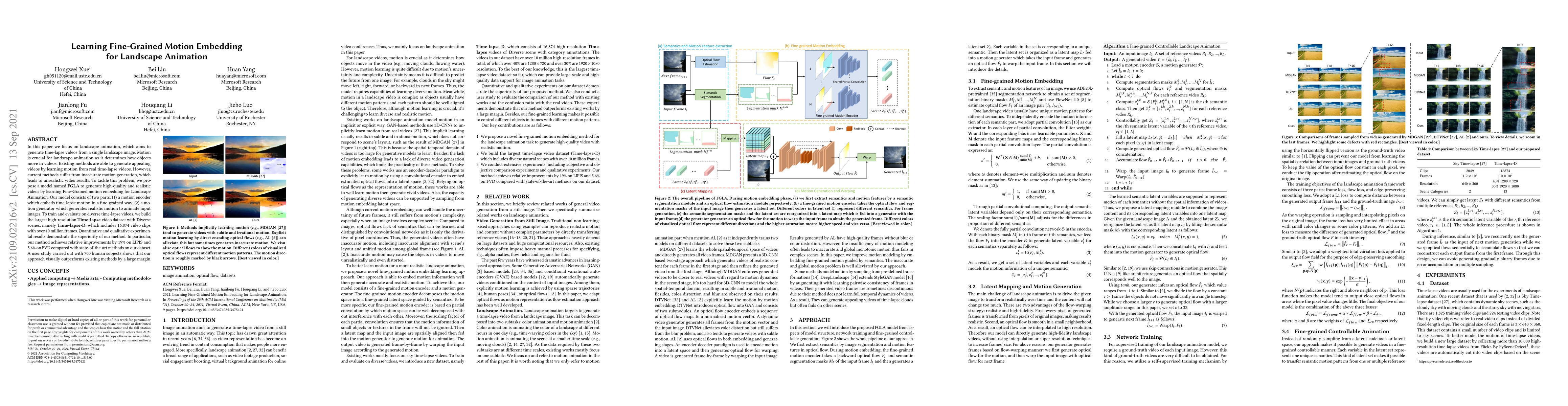 This paper proposes a model named FGLA to generate high-quality landscape animation videos by learning fine-grained motion embeddings. The FGLA model includes a motion encoder and a motion generator, and it is trained on a newly built large dataset, Time-lapse-D, showing significant improvements over existing methods in both quantitative metrics and human evaluations.