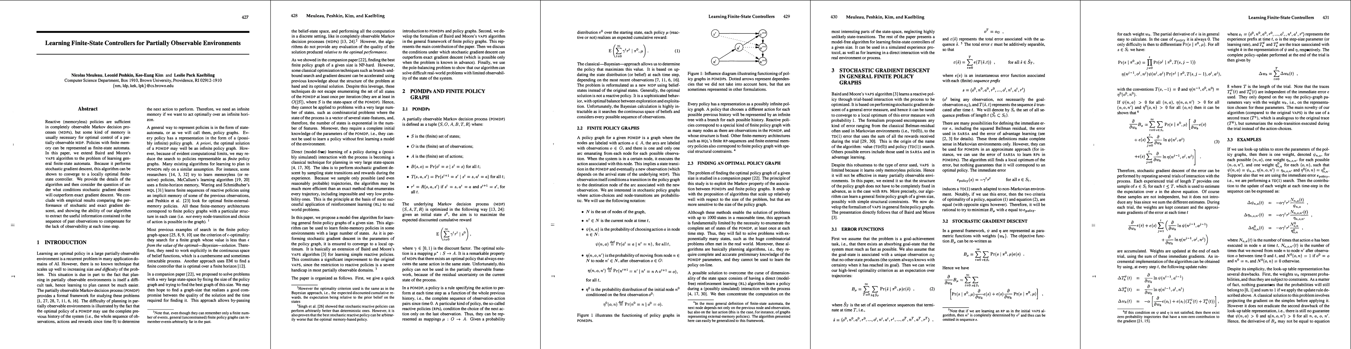 This paper presents an extension of the VAPS algorithm to learn finite-state automata for optimal control in partially observable environments. It demonstrates convergence to a locally optimal controller through stochastic gradient descent and compares its performance with exact gradient descent, showing its effectiveness in utilizing past observations.