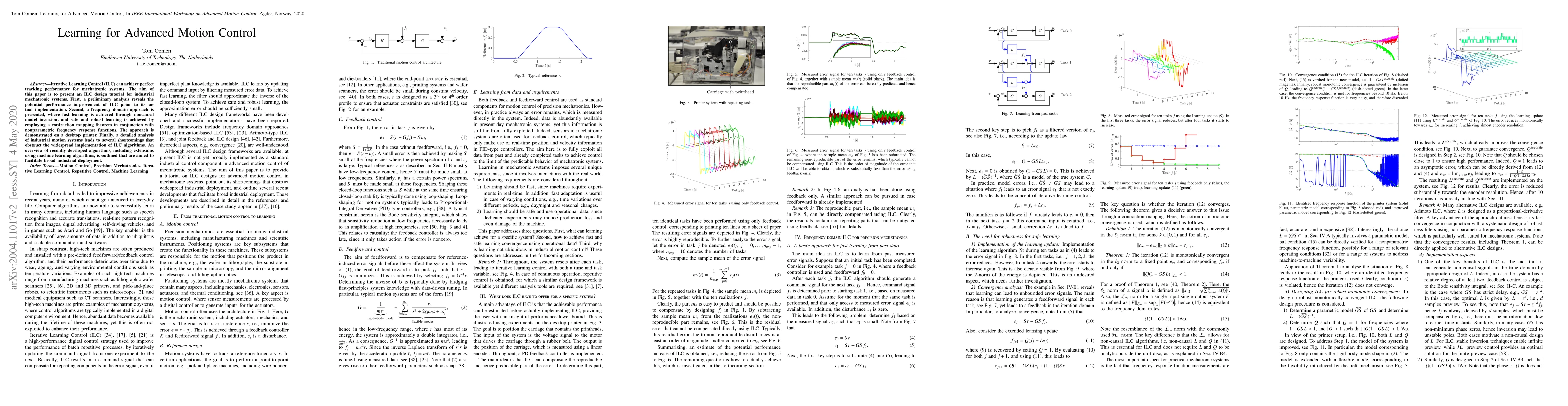 Iterative Learning Control (ILC) can achieve perfect tracking performance for mechatronic systems. The aim of this paper is to present an ILC design tutorial for industrial mechatronic systems. First, a preliminary analysis reveals the potential performance improvement of ILC prior to its actual implementation. Second, a frequency domain approach is presented, where fast learning is achieved through noncausal model inversion, and safe and robust learning is achieved by employing a contraction mapping theorem in conjunction with nonparametric frequency response functions. The approach is demonstrated on a desktop printer. Finally, a detailed analysis of industrial motion systems leads to several shortcomings that obstruct the widespread implementation of ILC algorithms. An overview of recently developed algorithms, including extensions using machine learning algorithms, is outlined that are aimed to facilitate broad industrial deployment.